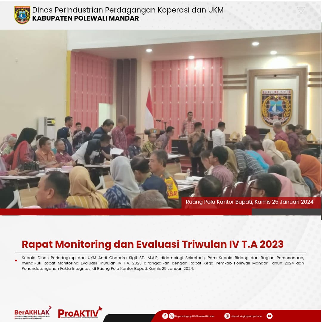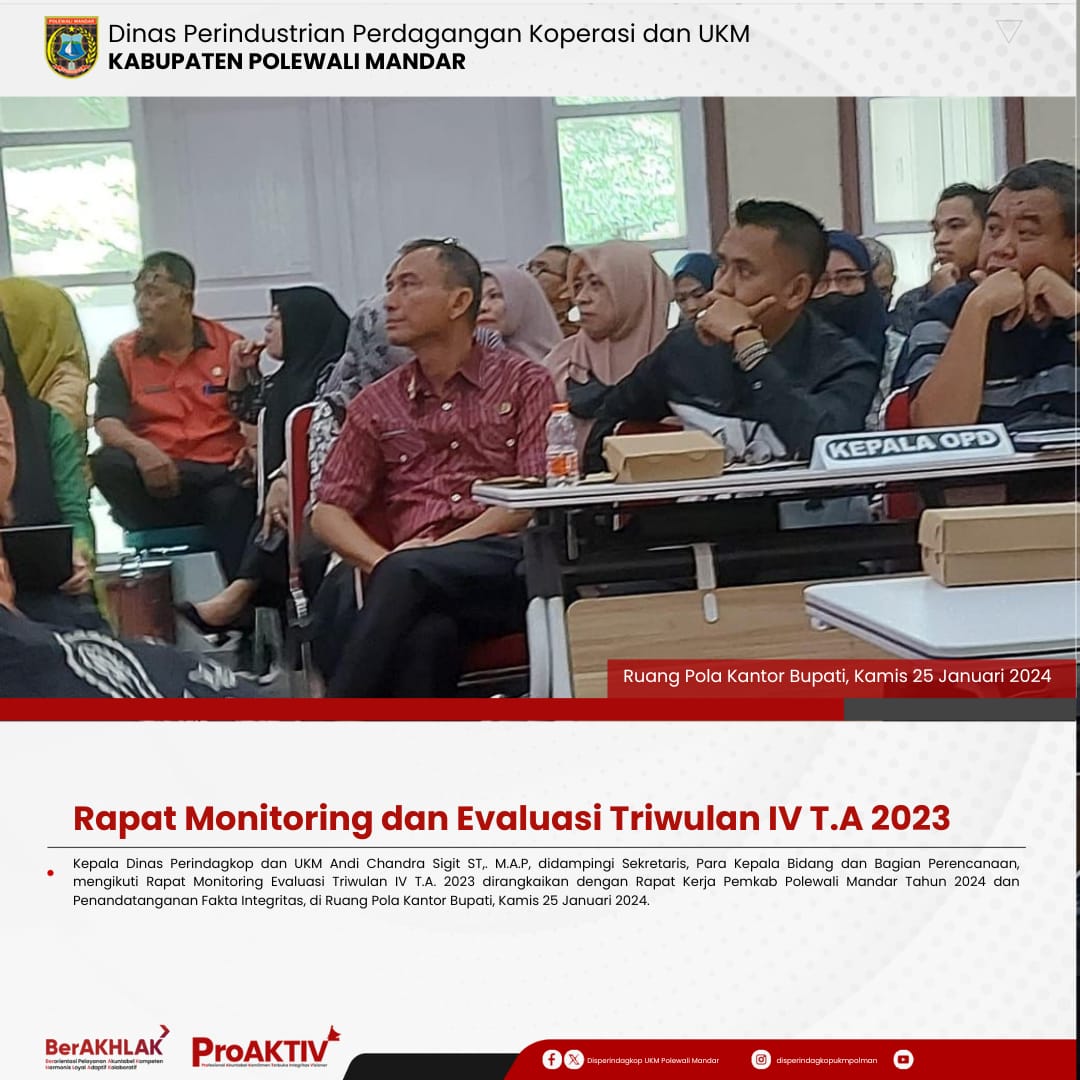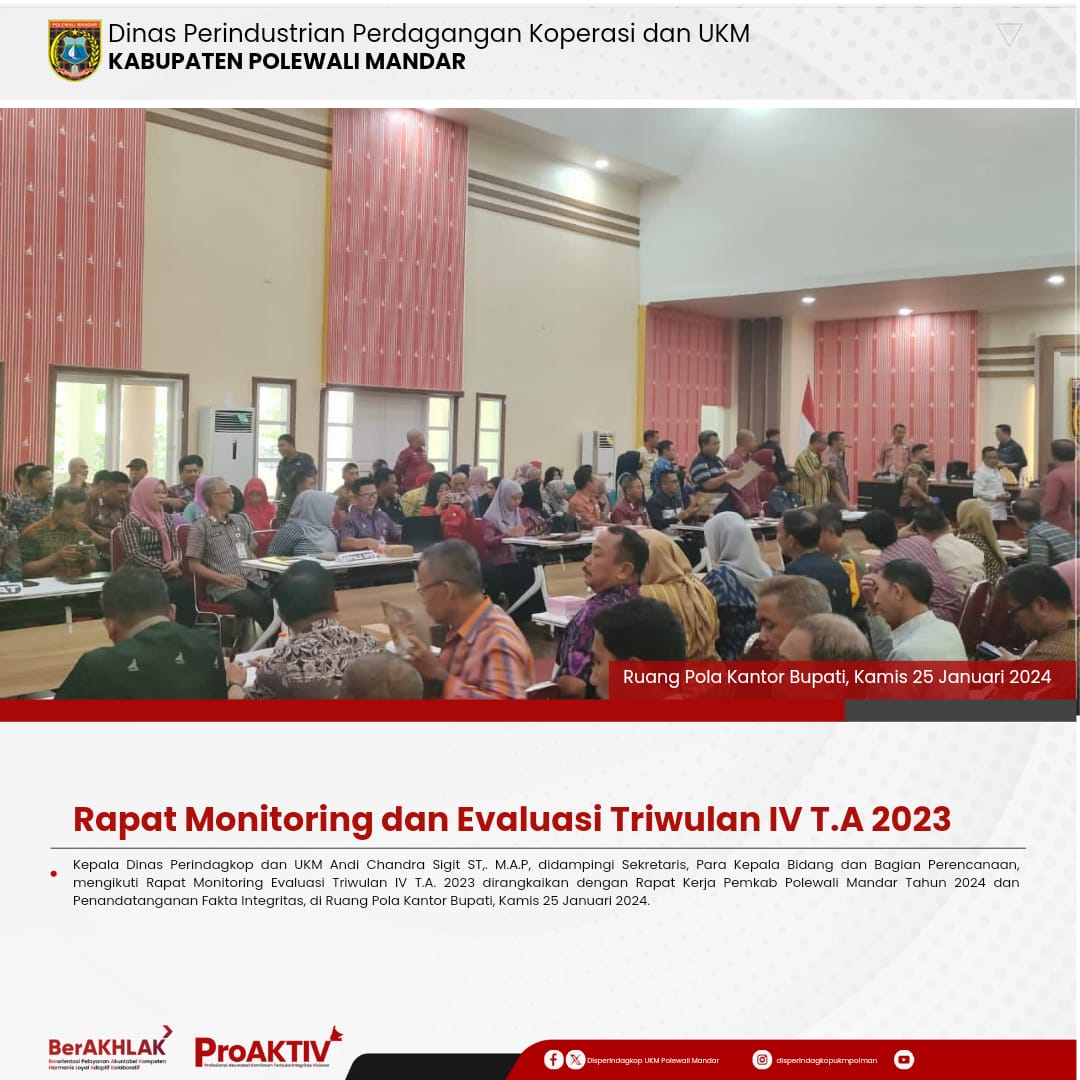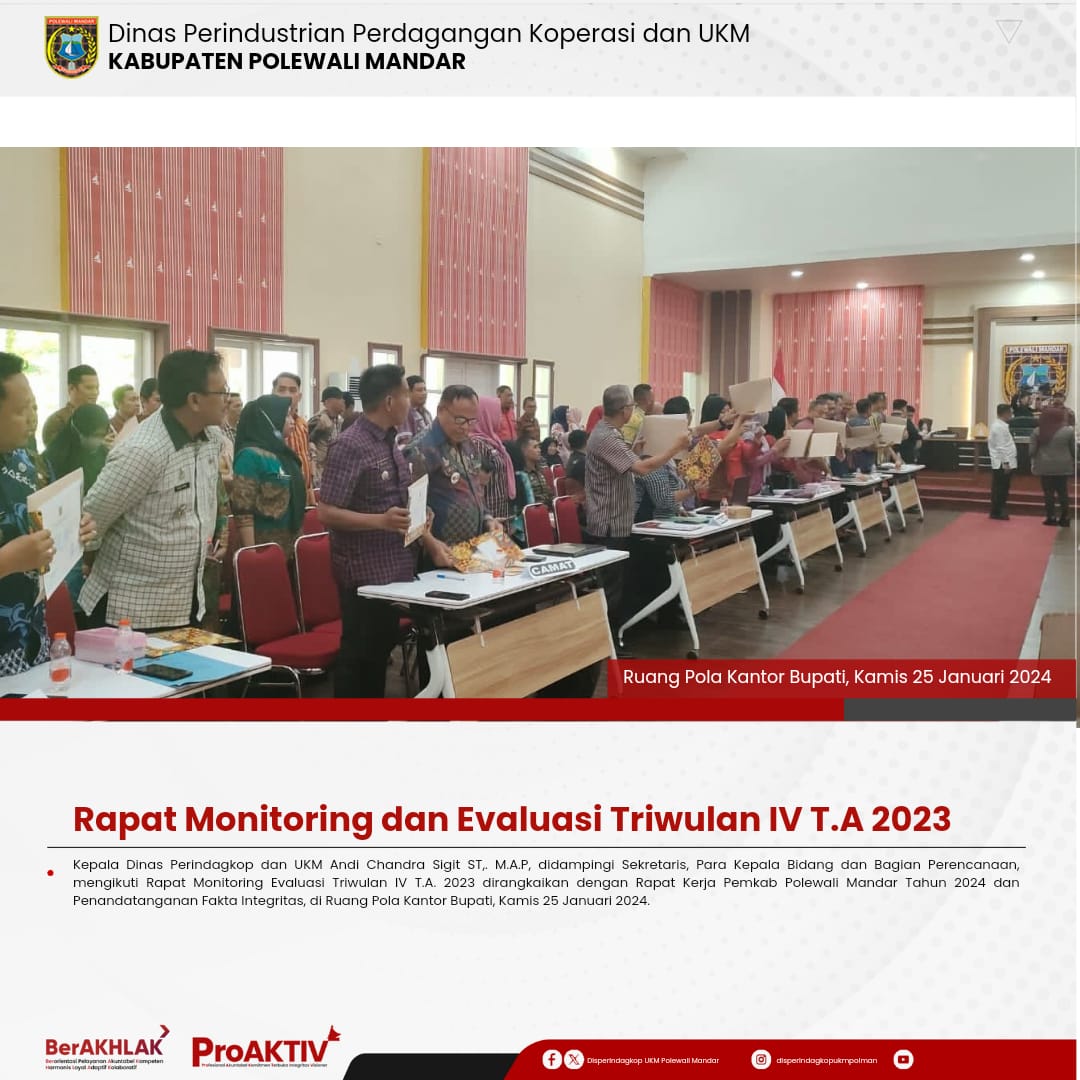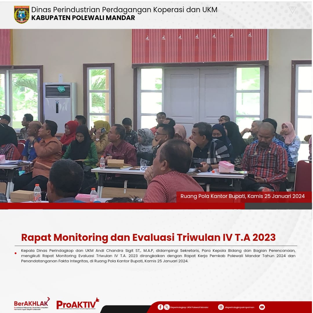 Kepala Dinas Perindagkop dan UKM Andi Chandra Sigit ST,. M.A.P, didampingi Sekretaris, Para Kepala Bidang dan Bagian Perencanaan, mengikuti Rapat Monitoring Evaluasi Triwulan IV T.A. 2023 dirangkaikan dengan Rapat Kerja Pemkab Polewali Mandar Tahun 2024 dan Penandatanganan Fakta Integritas.