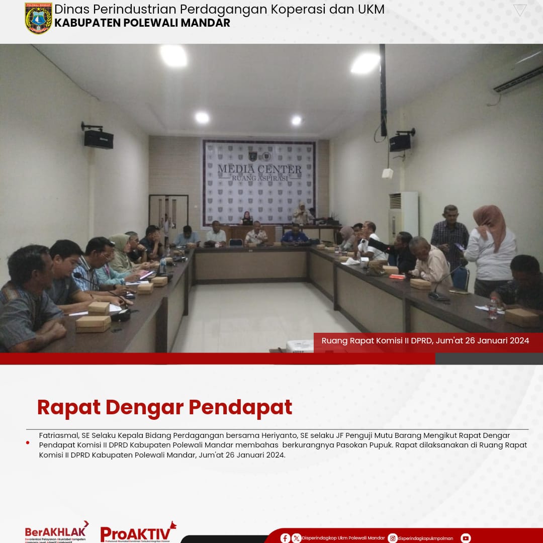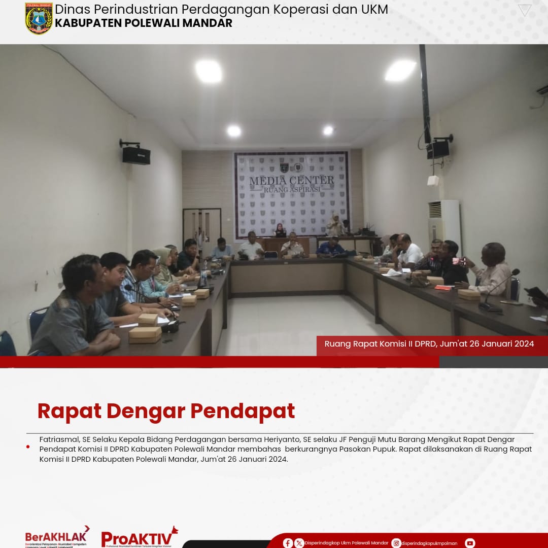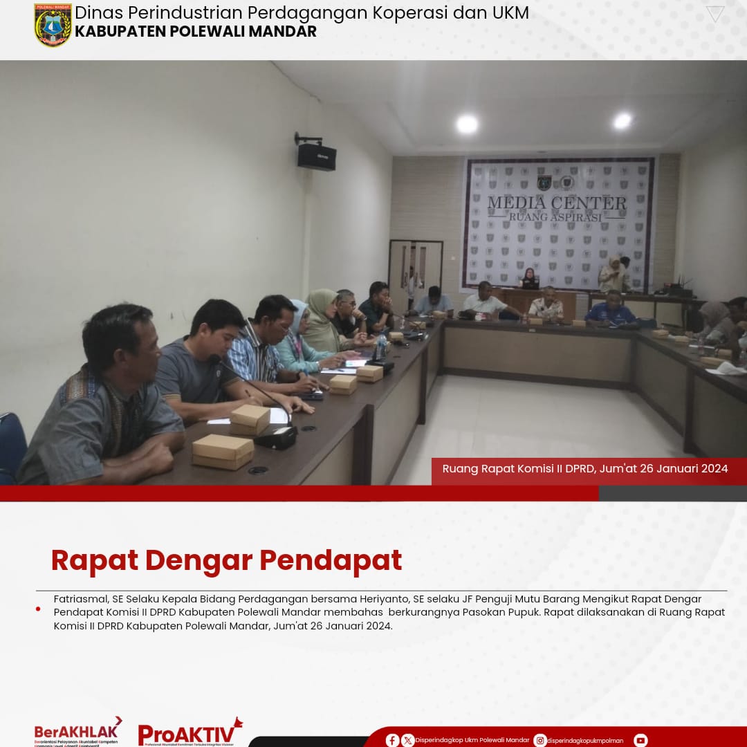 Fatriasmal, SE Selaku Kepala Bidang Perdagangan bersama Heriyanto, SE selaku JF Pengawas Mutu Produk Mengikut Rapat Dengar Pendapat Komisi II DPRD Kabupaten Polewali Mandar membahas berkurangnya Pasokan Pupuk. Rapat dilaksanakan di Ruang Rapat Komisi II DPRD Kabupaten Polewali Mandar, Jum'at 26 Januari 2024.