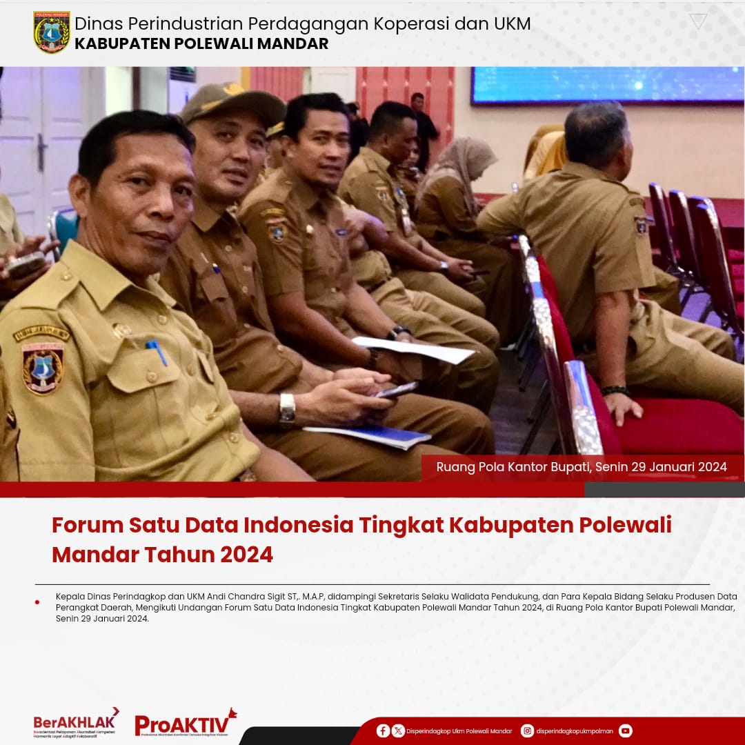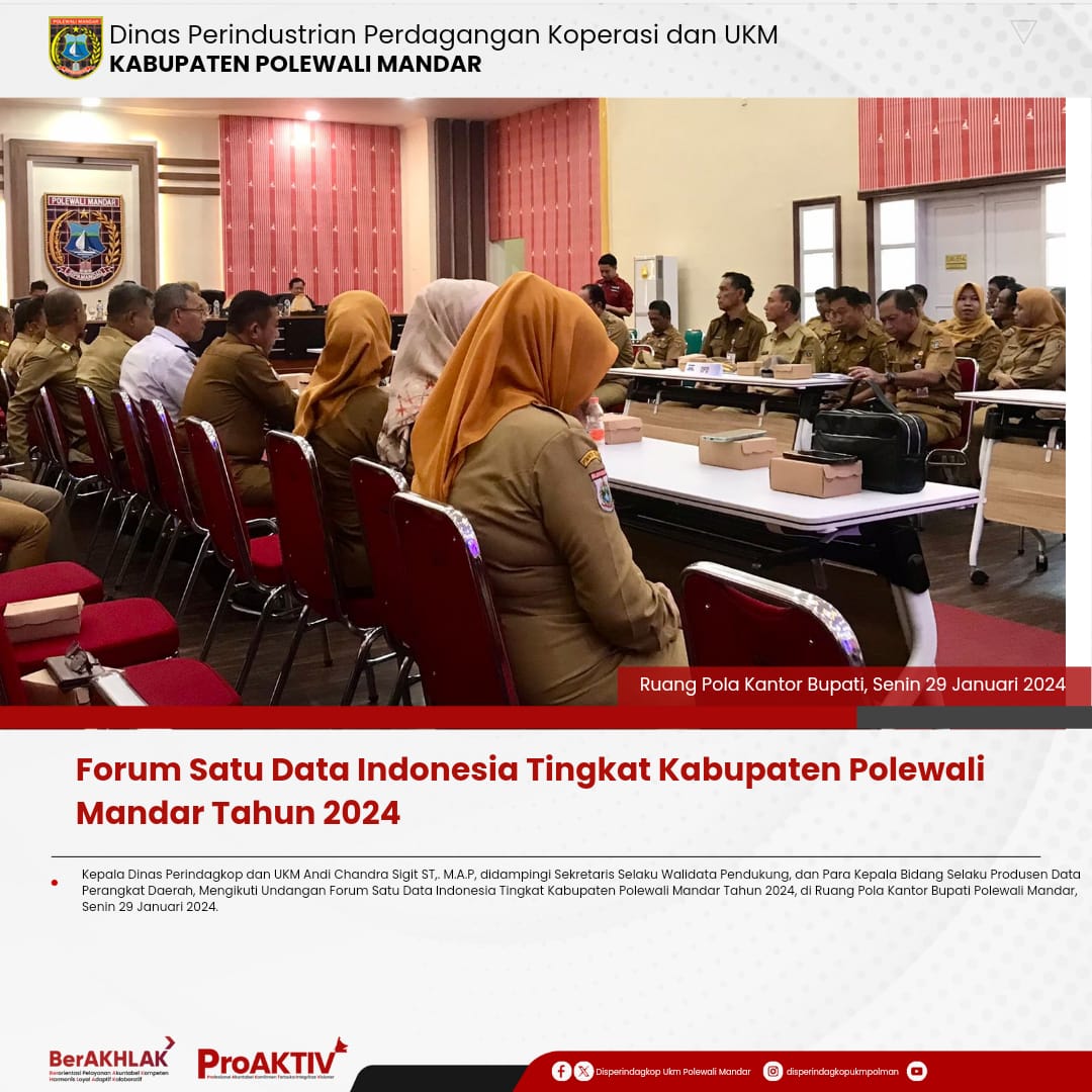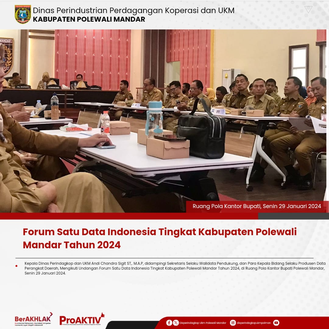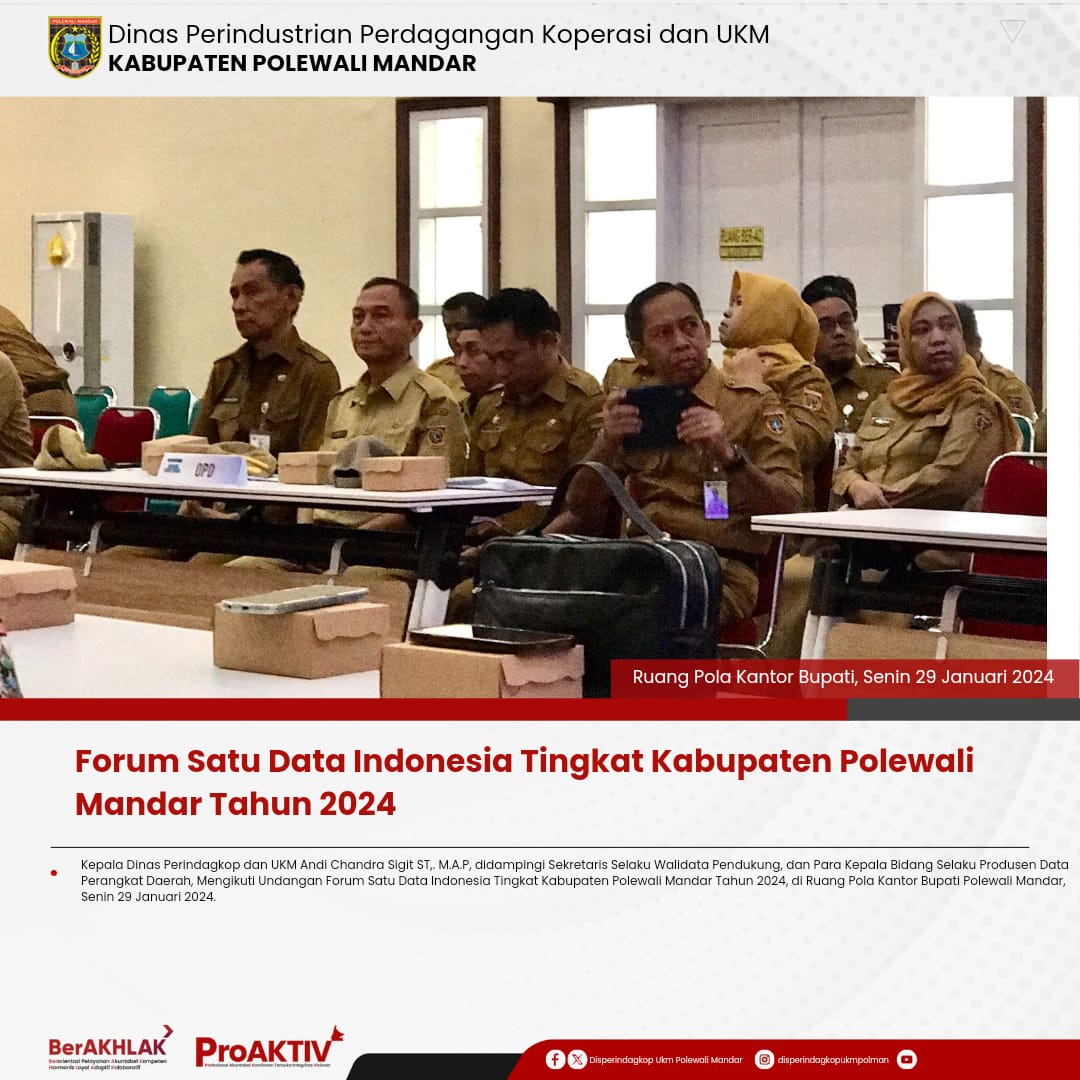 Kepala Dinas Perindagkop dan UKM Andi Chandra Sigit ST,. M.A.P, didampingi Sekretaris Selaku Walidata Pendukung, dan Para Kepala Bidang Selaku Produsen Data Perangkat Daerah, Mengikuti Undangan Forum Satu Data Indonesia Tingkat Kabupaten Polewali Mandar Tahun 2024, di Ruang Pola Kantor Bupati Polewali Mandar, Senin 29 Januari 2024.