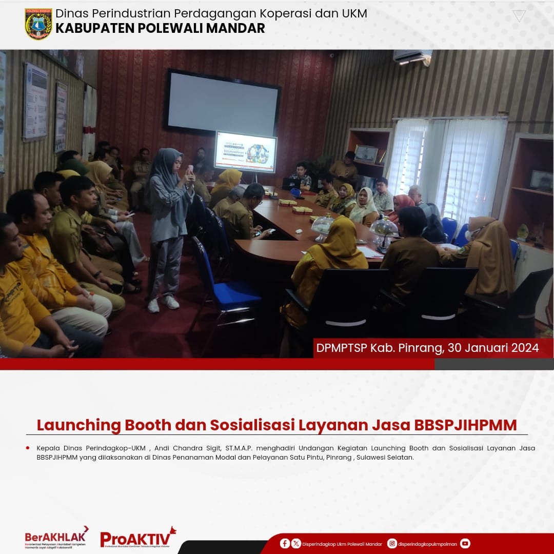 Kepala Dinas Perindagkop-UKM , Andi Chandra Sigit, ST.M.A.P. menghadiri Undangan Kegiatan Launching Booth dan Sosialisasi Layanan Jasa BBSPJIHPMM yang dilaksanakan di Dinas Penanaman Modal dan Pelayanan Satu Pintu, Pinrang , Sulawesi Selatan.