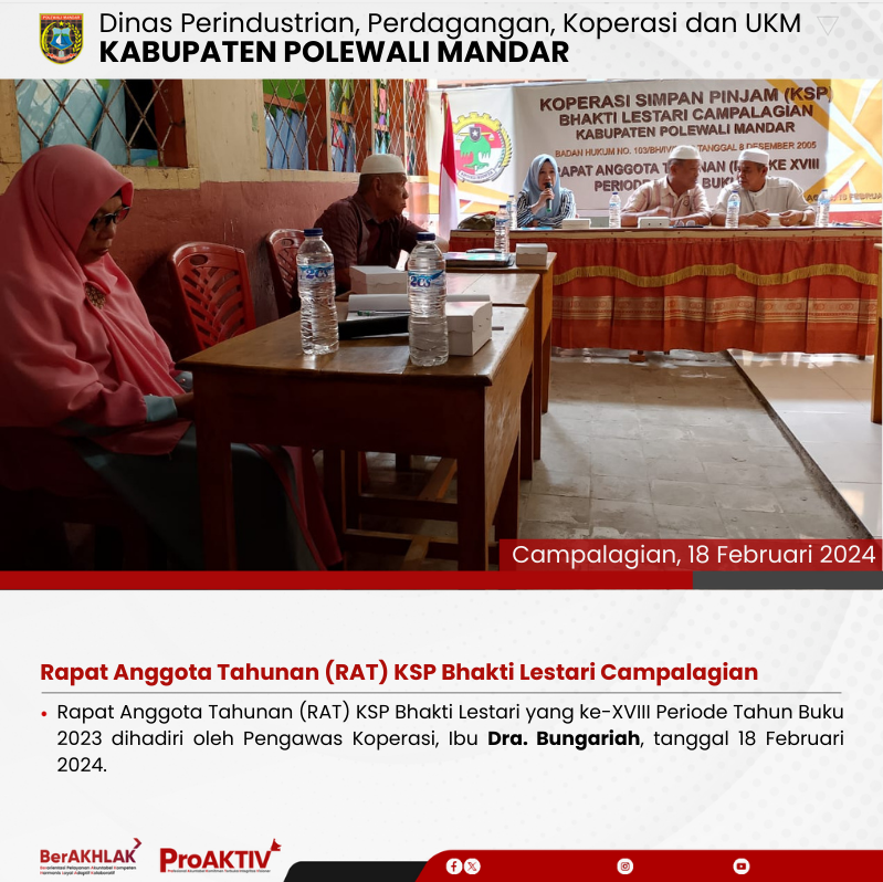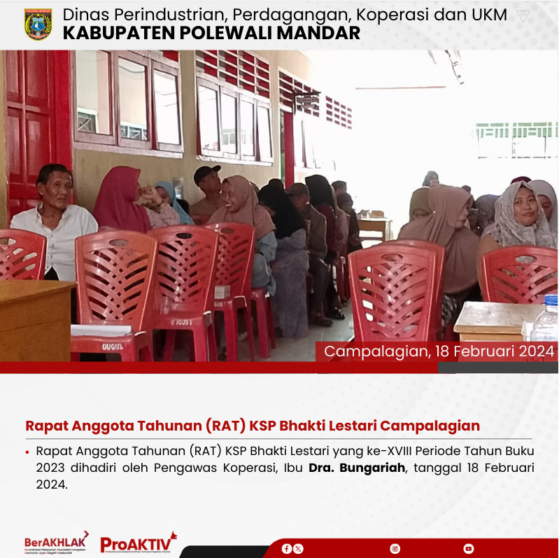Kepala Dinas Perindustrian, Perdagangan, Koperasi dan UKM Kabupaten Polewali Mandar, Andi Chandra Sigit, ST., M.A.P beserta Kepala Bidang Koperasi, Nabil Wijdan Al Hamdani, S.STP. M.Si menghadiri undangan Rapat Konsolidasi Koperasi Desa Merah Putih yang berlangsung di Hotel Maleo pada tanggal 6 hingga 8 November 2025. Kegiatan ini dilaksanakan dalam rangka memperkuat koordinasi dan sinergitas antar lembaga dalam pengembangan sektor koperasi dan usaha kecil menengah di daerah....