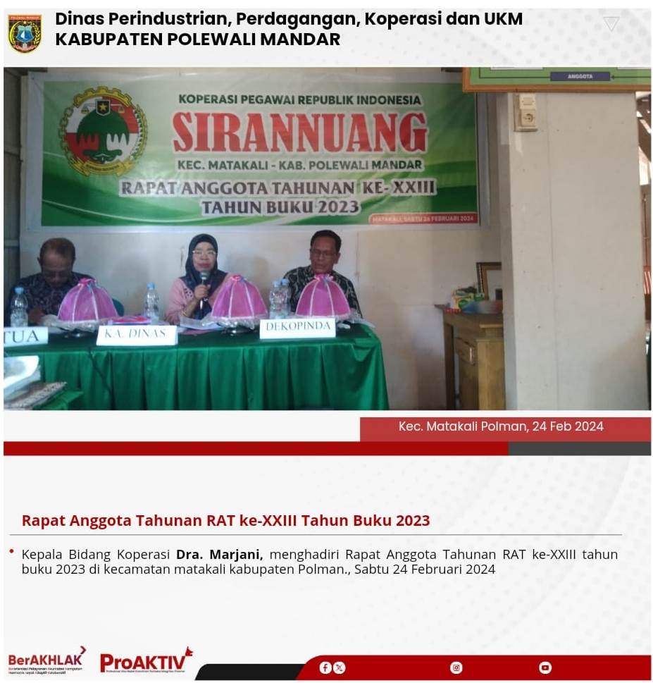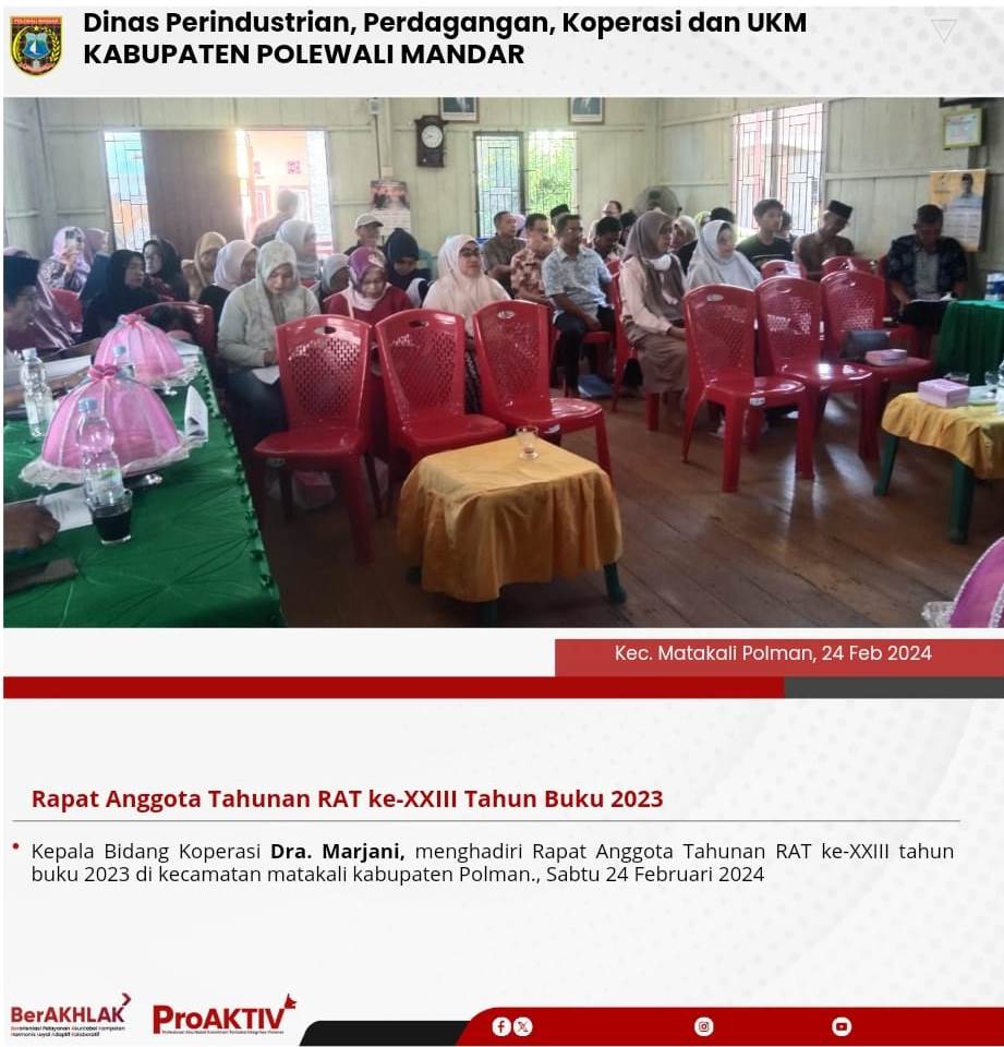 Kepala Dinas Perindustrian, Perdagangan, Koperasi dan UKM Kabupaten Polewali Mandar, Andi Chandra Sigit, ST., M.A.P beserta Kepala Bidang Koperasi, Nabil Wijdan Al Hamdani, S.STP. M.Si menghadiri undangan Rapat Konsolidasi Koperasi Desa Merah Putih yang berlangsung di Hotel Maleo pada tanggal 6 hingga 8 November 2025. Kegiatan ini dilaksanakan dalam rangka memperkuat koordinasi dan sinergitas antar lembaga dalam pengembangan sektor koperasi dan usaha kecil menengah di daerah....