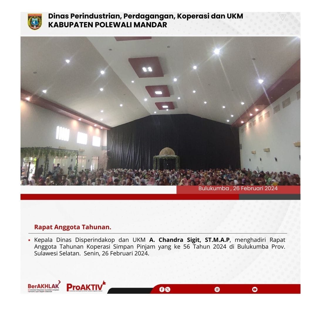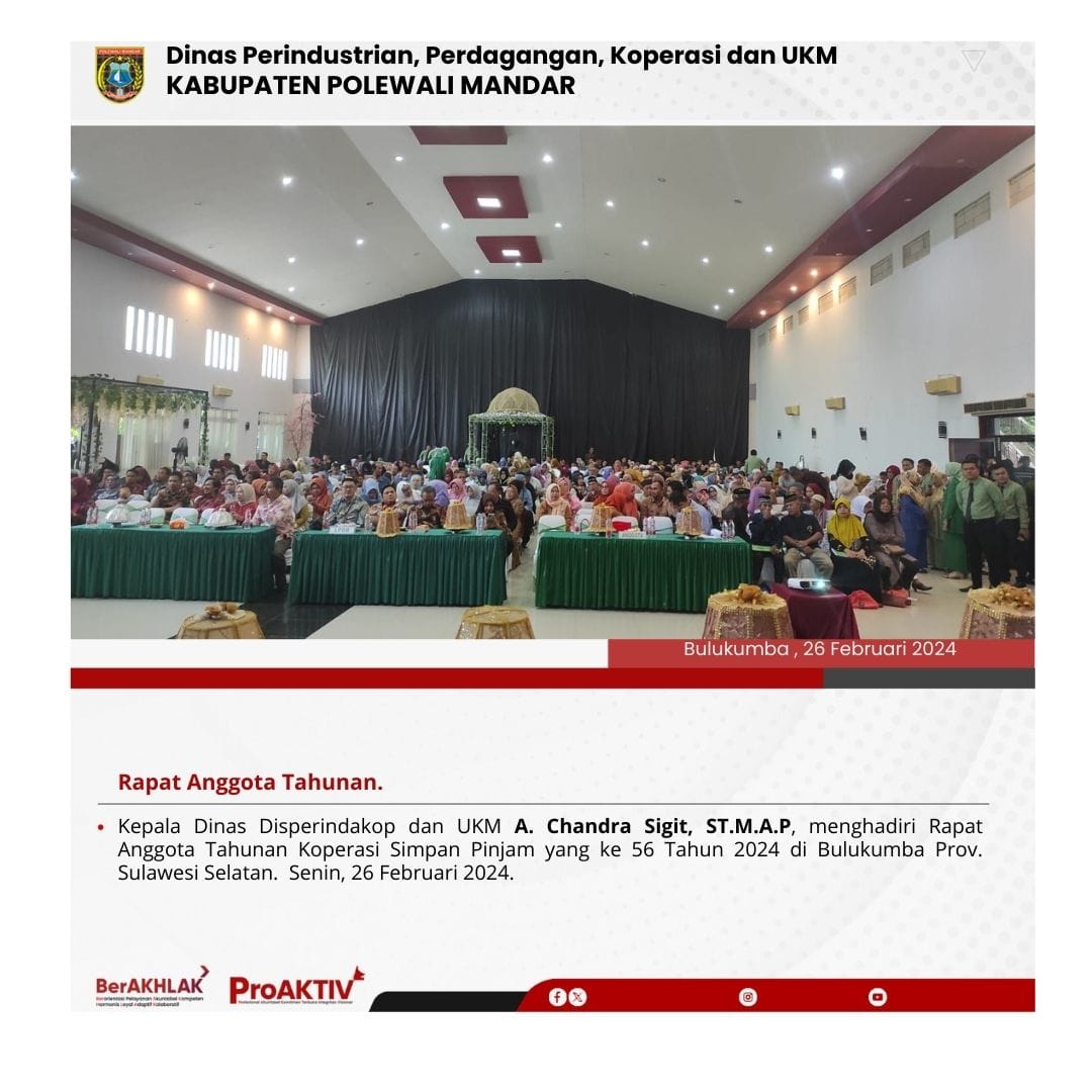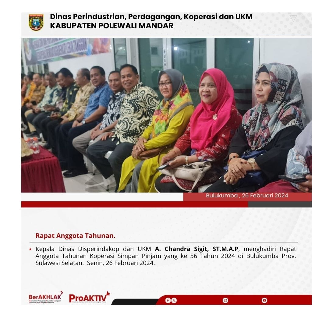 Kepala Dinas Perindustrian, Perdagangan, Koperasi dan UKM Kabupaten Polewali Mandar, Andi Chandra Sigit, ST., M.A.P beserta Kepala Bidang Koperasi, Nabil Wijdan Al Hamdani, S.STP. M.Si menghadiri undangan Rapat Konsolidasi Koperasi Desa Merah Putih yang berlangsung di Hotel Maleo pada tanggal 6 hingga 8 November 2025. Kegiatan ini dilaksanakan dalam rangka memperkuat koordinasi dan sinergitas antar lembaga dalam pengembangan sektor koperasi dan usaha kecil menengah di daerah....