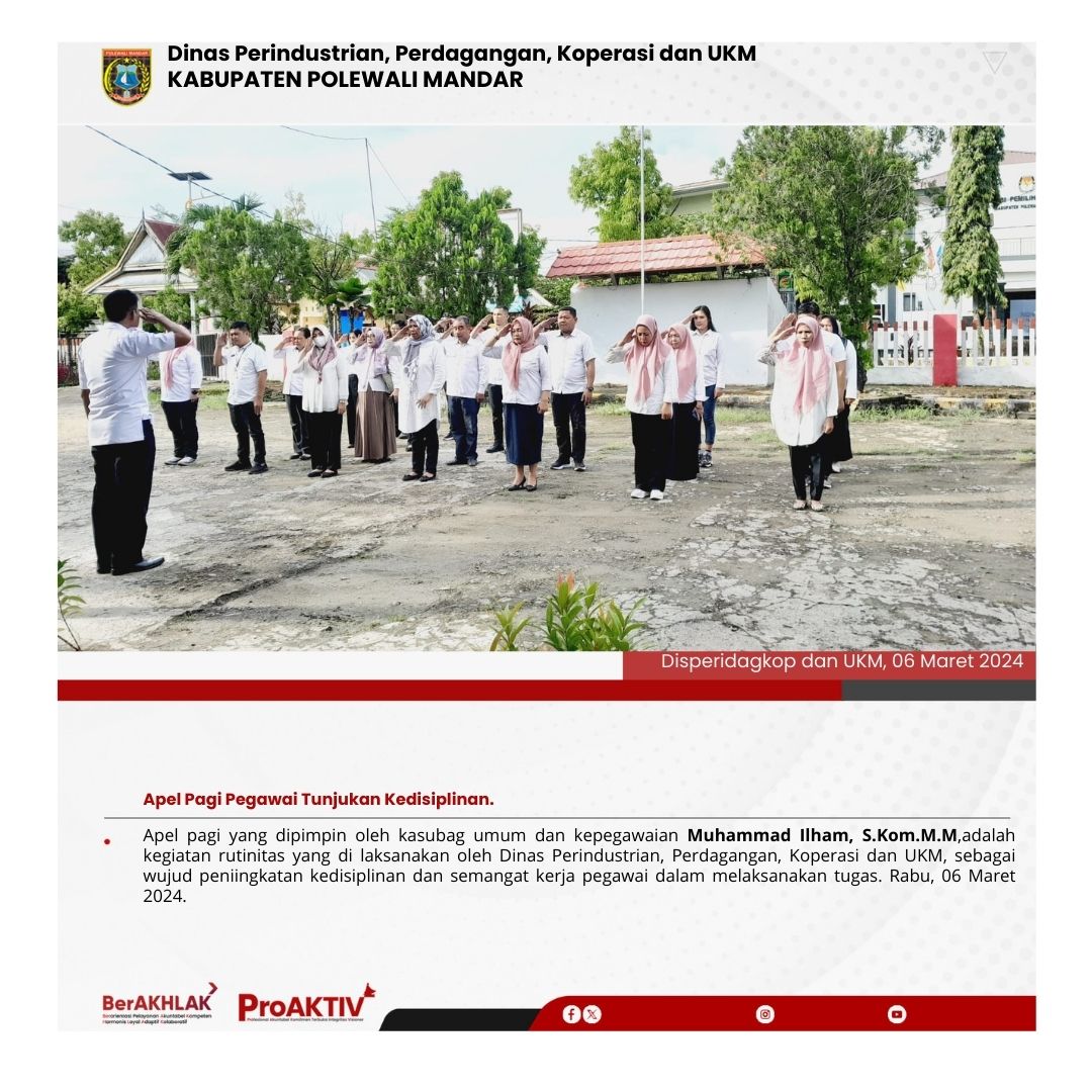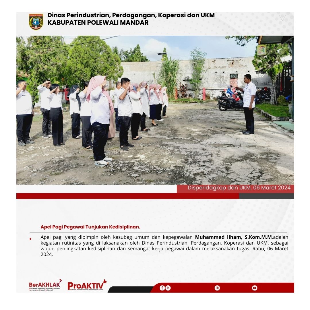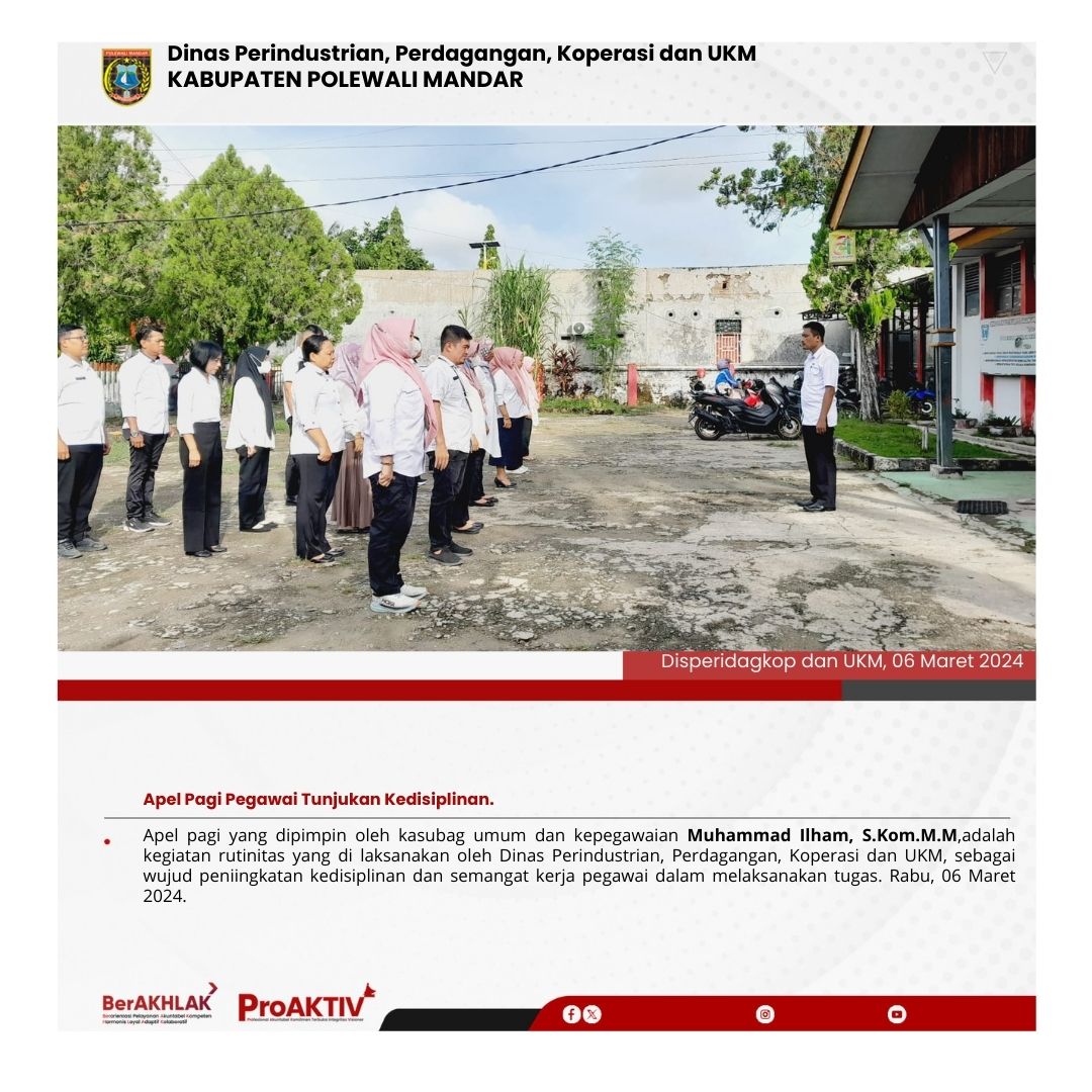 Dinas Perindustrian, Perdagangan, Koperasi dan UKM Kabupaten Polewali Mandar kembali menggelar kegiatan Jumat Bersih pada hari ini. Seluruh pejabat struktural, staf, hingga pegawai non-ASN terlibat aktif dalam menjaga kebersihan lingkungan kantor. Jumat, 07 November 2025...