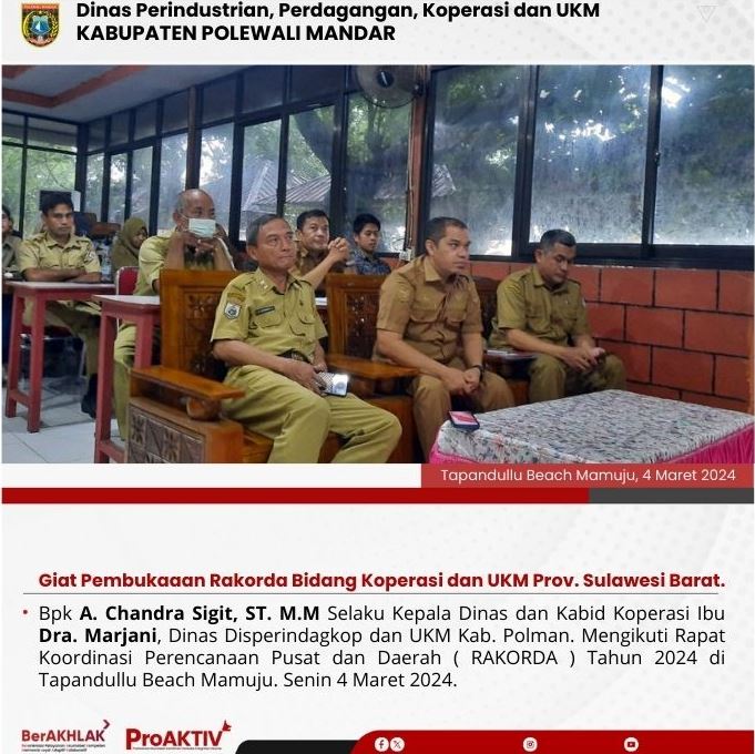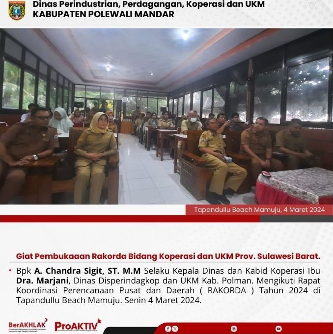 Kepala Dinas Perindustrian, Perdagangan, Koperasi dan UKM Kabupaten Polewali Mandar, Andi Chandra Sigit, ST., M.A.P beserta Kepala Bidang Koperasi, Nabil Wijdan Al Hamdani, S.STP. M.Si menghadiri undangan Rapat Konsolidasi Koperasi Desa Merah Putih yang berlangsung di Hotel Maleo pada tanggal 6 hingga 8 November 2025. Kegiatan ini dilaksanakan dalam rangka memperkuat koordinasi dan sinergitas antar lembaga dalam pengembangan sektor koperasi dan usaha kecil menengah di daerah....