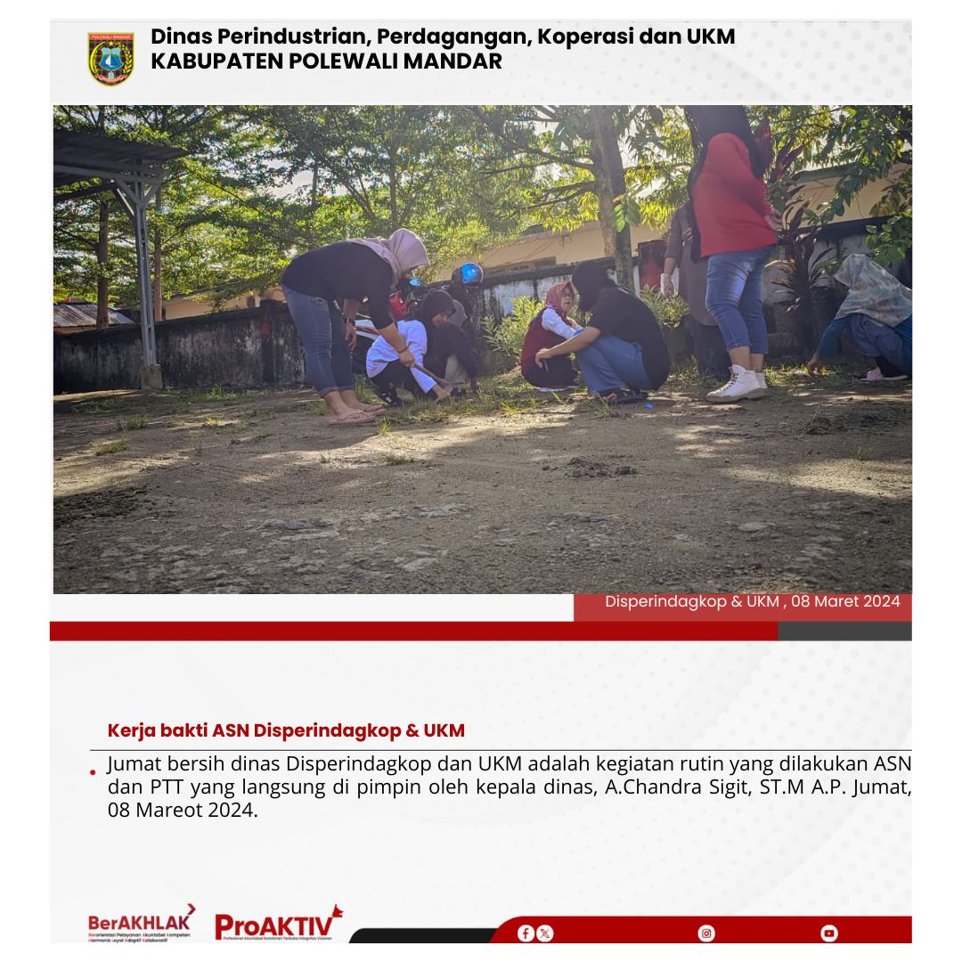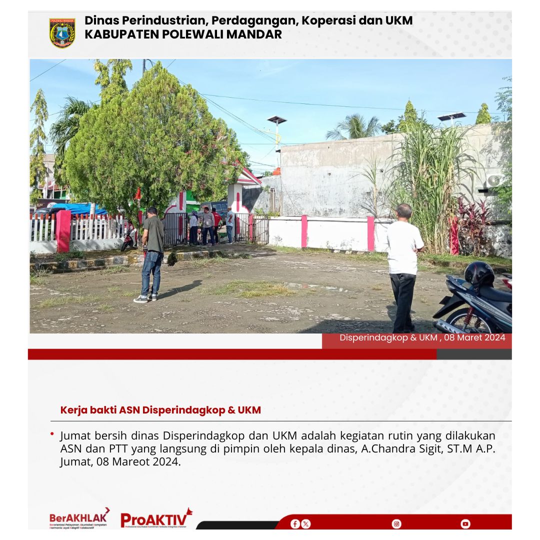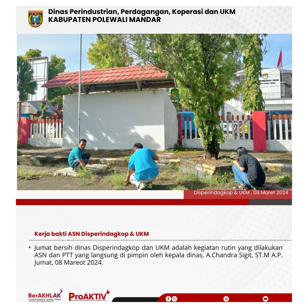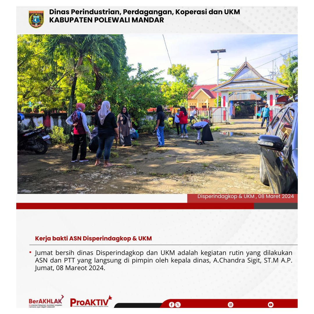 Dinas Perindustrian, Perdagangan, Koperasi dan UKM Kabupaten Polewali Mandar kembali menggelar kegiatan Jumat Bersih pada hari ini. Seluruh pejabat struktural, staf, hingga pegawai non-ASN terlibat aktif dalam menjaga kebersihan lingkungan kantor. Jumat, 07 November 2025...
