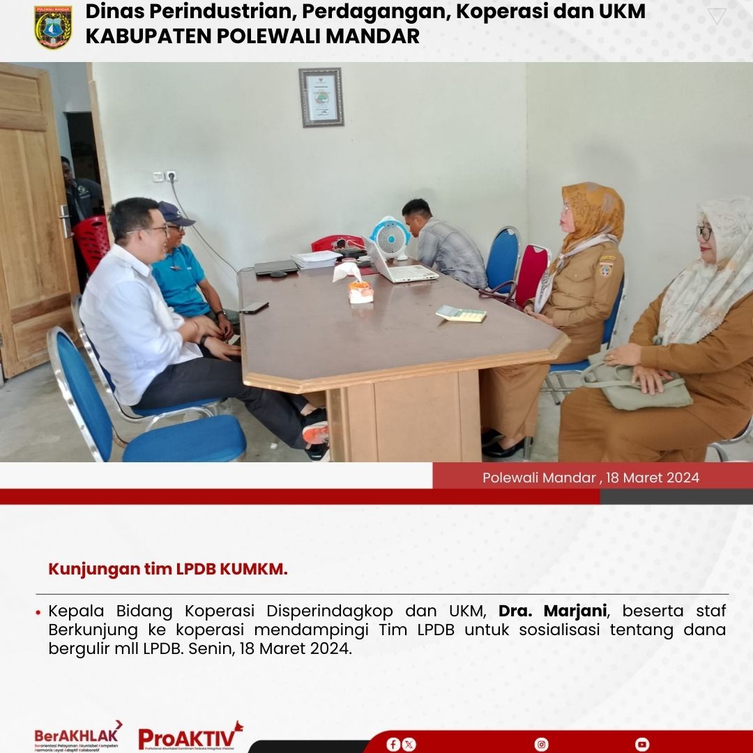 Kepala Dinas Perindustrian, Perdagangan, Koperasi dan UKM Kabupaten Polewali Mandar, Andi Chandra Sigit, ST., M.A.P beserta Kepala Bidang Koperasi, Nabil Wijdan Al Hamdani, S.STP. M.Si menghadiri undangan Rapat Konsolidasi Koperasi Desa Merah Putih yang berlangsung di Hotel Maleo pada tanggal 6 hingga 8 November 2025. Kegiatan ini dilaksanakan dalam rangka memperkuat koordinasi dan sinergitas antar lembaga dalam pengembangan sektor koperasi dan usaha kecil menengah di daerah....