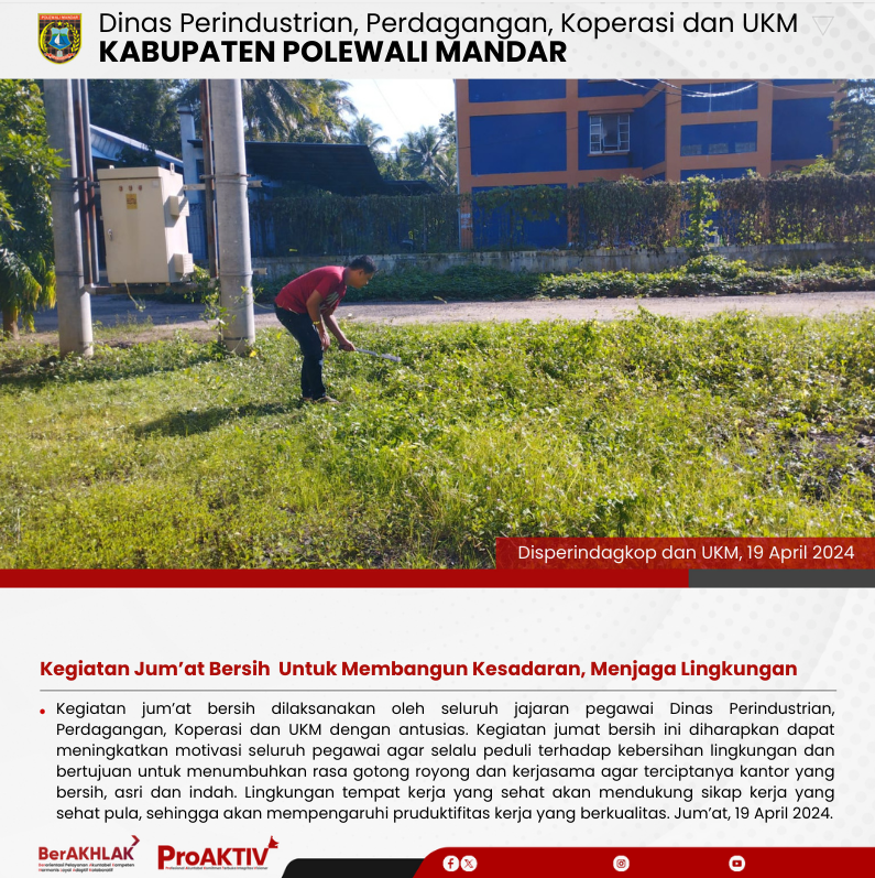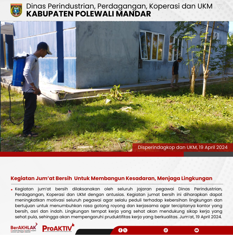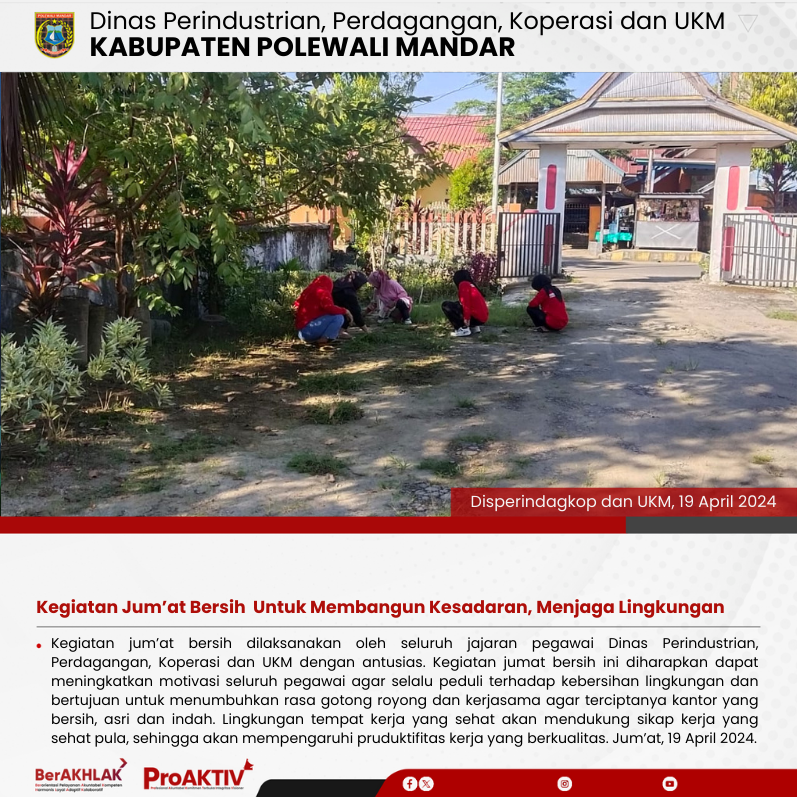 Dinas Perindustrian, Perdagangan, Koperasi dan UKM Kabupaten Polewali Mandar kembali menggelar kegiatan Jumat Bersih pada hari ini. Seluruh pejabat struktural, staf, hingga pegawai non-ASN terlibat aktif dalam menjaga kebersihan lingkungan kantor. Jumat, 07 November 2025...