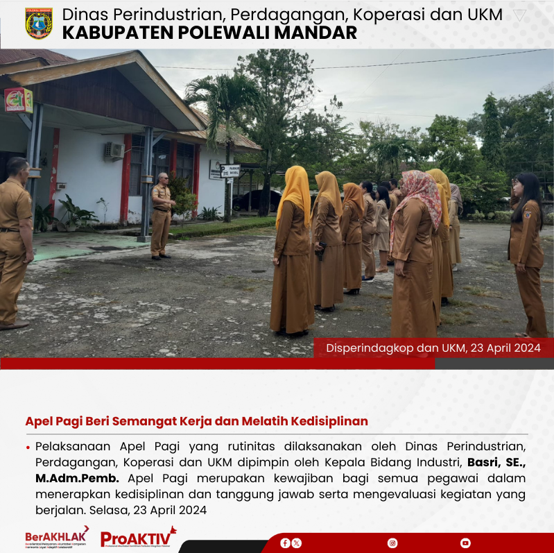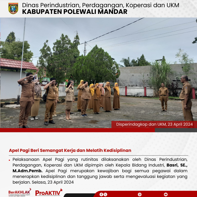Dinas Perindustrian, Perdagangan, Koperasi dan UKM Kabupaten Polewali Mandar kembali menggelar kegiatan Jumat Bersih pada hari ini. Seluruh pejabat struktural, staf, hingga pegawai non-ASN terlibat aktif dalam menjaga kebersihan lingkungan kantor. Jumat, 07 November 2025...