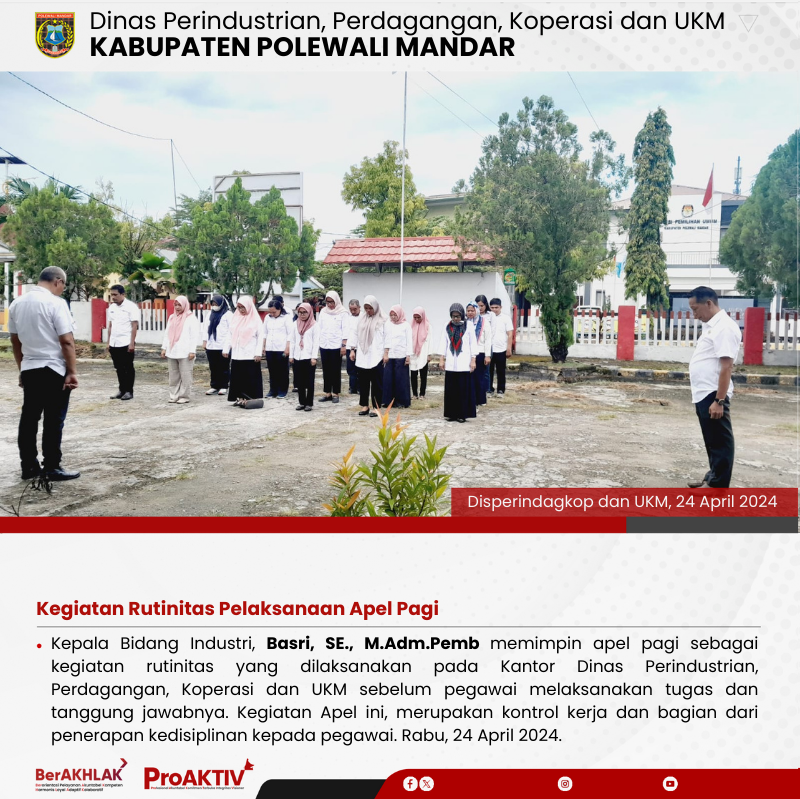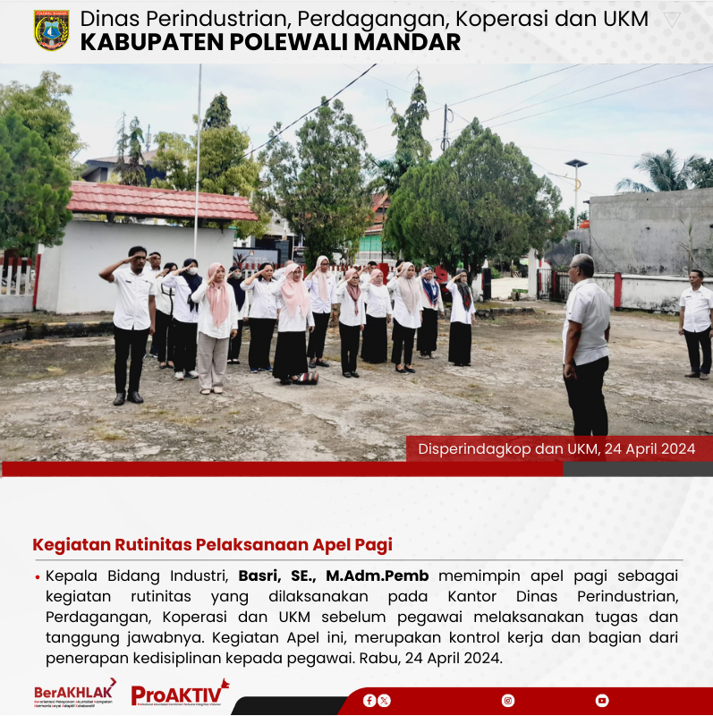 Dinas Perindustrian, Perdagangan, Koperasi dan UKM Kabupaten Polewali Mandar kembali menggelar kegiatan Jumat Bersih pada hari ini. Seluruh pejabat struktural, staf, hingga pegawai non-ASN terlibat aktif dalam menjaga kebersihan lingkungan kantor. Jumat, 07 November 2025...