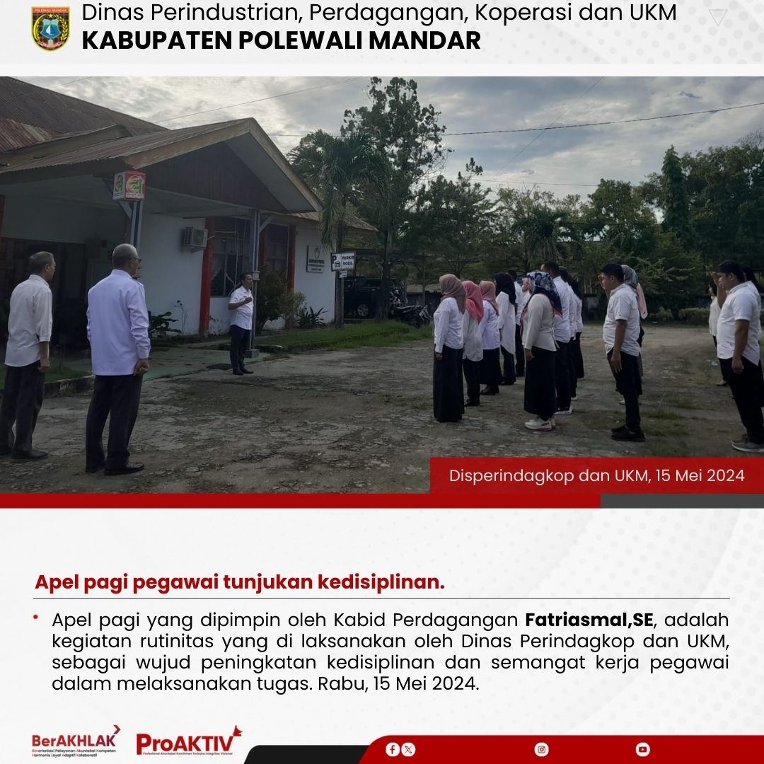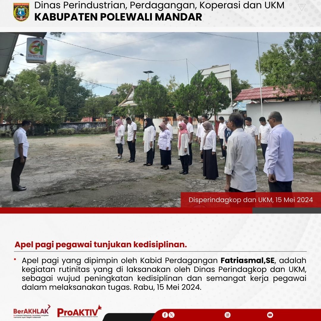 Dinas Perindustrian, Perdagangan, Koperasi dan UKM Kabupaten Polewali Mandar kembali menggelar kegiatan Jumat Bersih pada hari ini. Seluruh pejabat struktural, staf, hingga pegawai non-ASN terlibat aktif dalam menjaga kebersihan lingkungan kantor. Jumat, 07 November 2025...