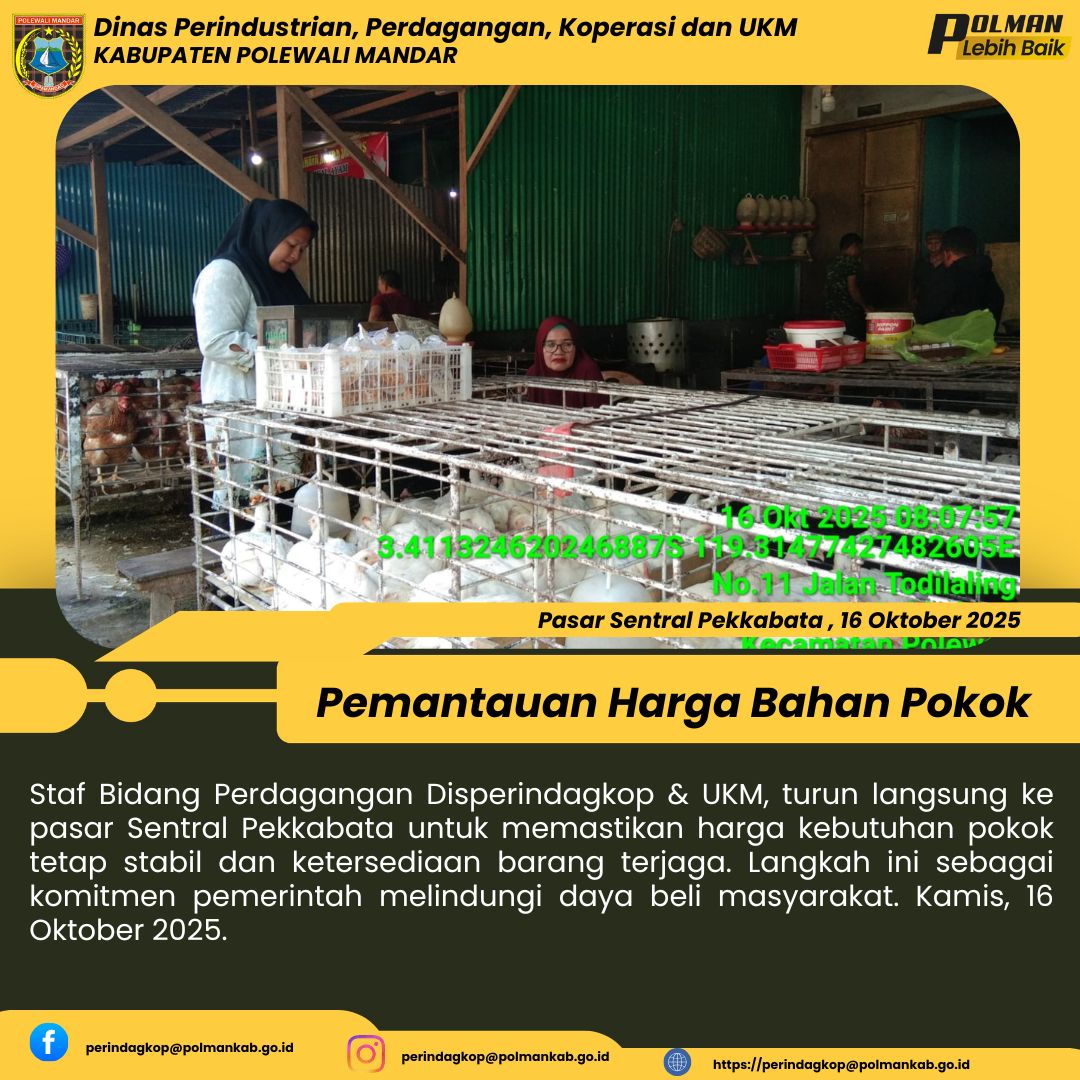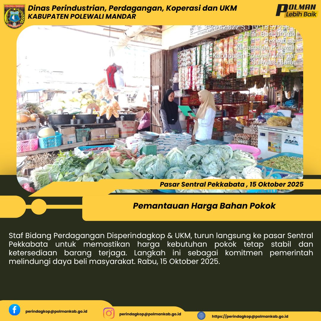 Staf Bidang Perdagangan Disperindagkop & UKM, turun langsung ke pasar Sentral Pekkabata untuk memastikan harga kebutuhan pokok tetap stabil dan ketersediaan barang terjaga. Langkah ini sebagai komitmen pemerintah melindungi daya beli masyarakat. Kamis, 16 Oktober 2025....