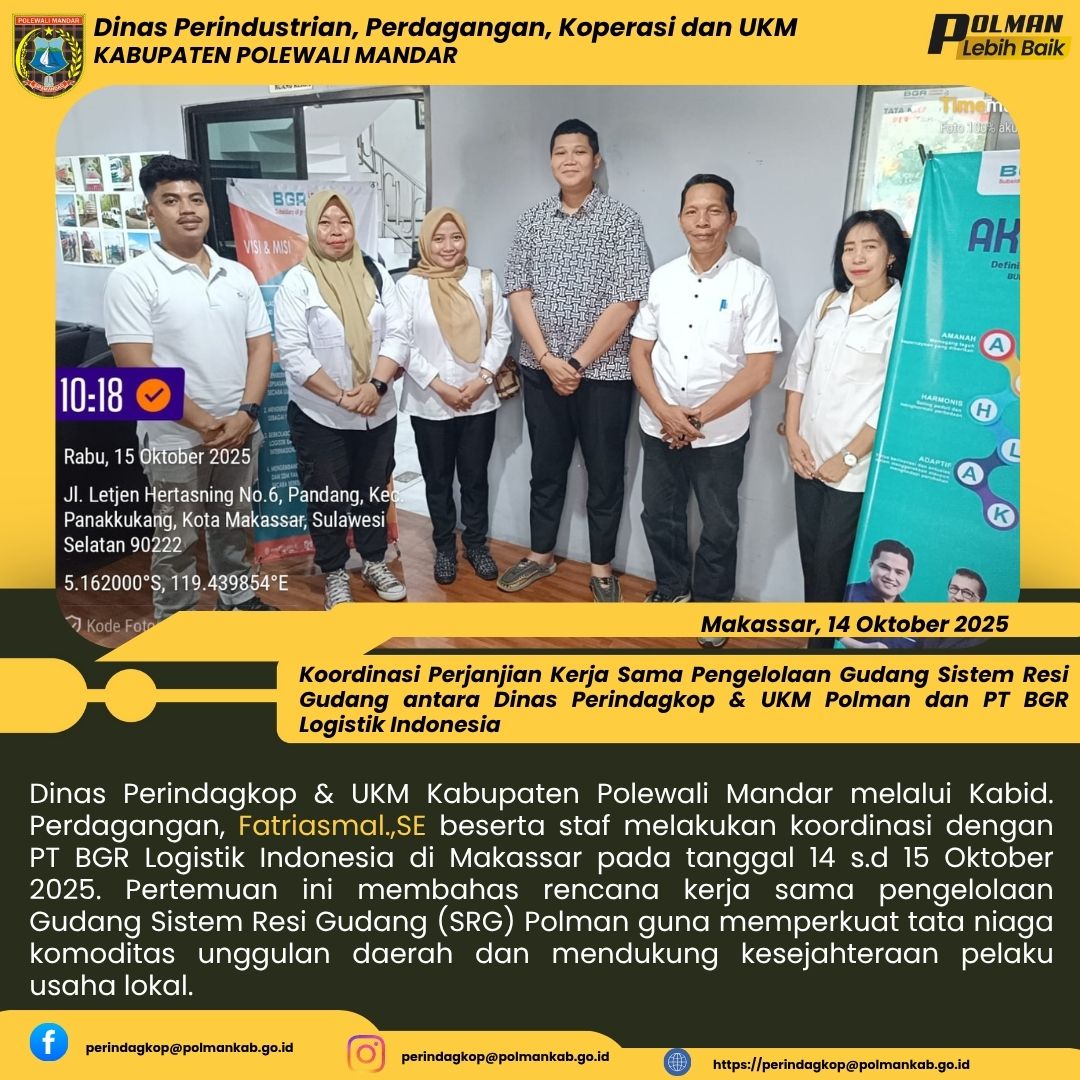 Dinas Perindagkop & UKM Kabupaten Polewali Mandar melalui Kabid. Perdagangan, Fatriasmal.,SE beserta staf melakukan koordinasi dengan PT BGR Logistik Indonesia di Makassar pada tanggal 14 s.d 15 Oktober 2025. Pertemuan ini membahas rencana kerja sama pengelolaan Gudang Sistem Resi Gudang (SRG) Polman guna memperkuat tata niaga komoditas unggulan daerah dan mendukung kesejahteraan pelaku usaha lokal....