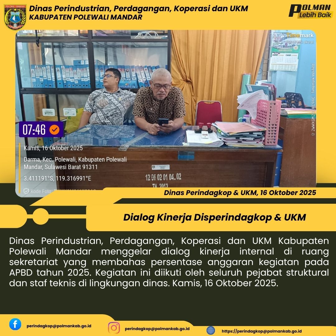 Dinas Perindustrian, Perdagangan, Koperasi dan UKM Kabupaten Polewali Mandar menggelar dialog kinerja internal di ruang sekretariat yang membahas persentase anggaran kegiatan pada APBD tahun 2025. Kegiatan ini diikuti oleh seluruh pejabat struktural dan staf teknis di lingkungan dinas. Kamis, 16 Oktober 2025....