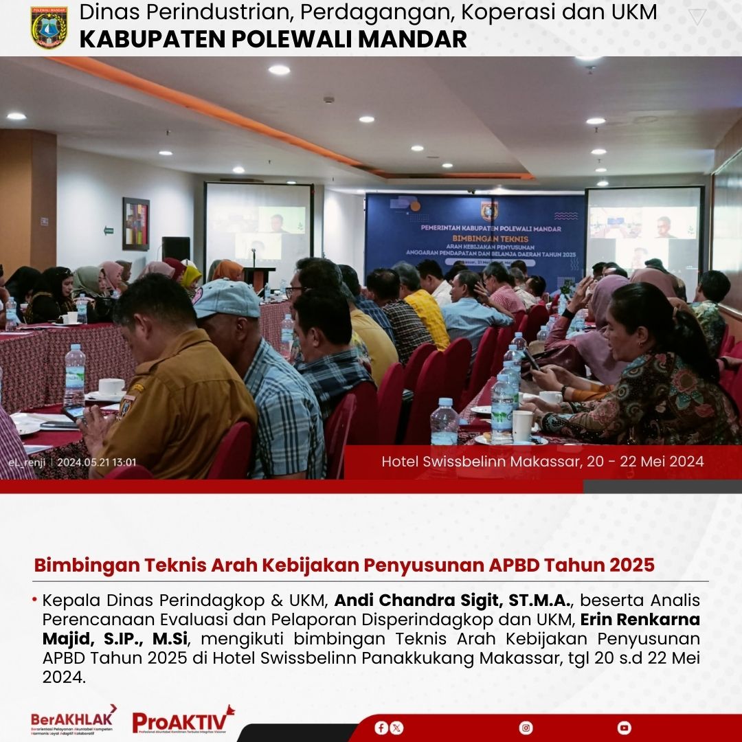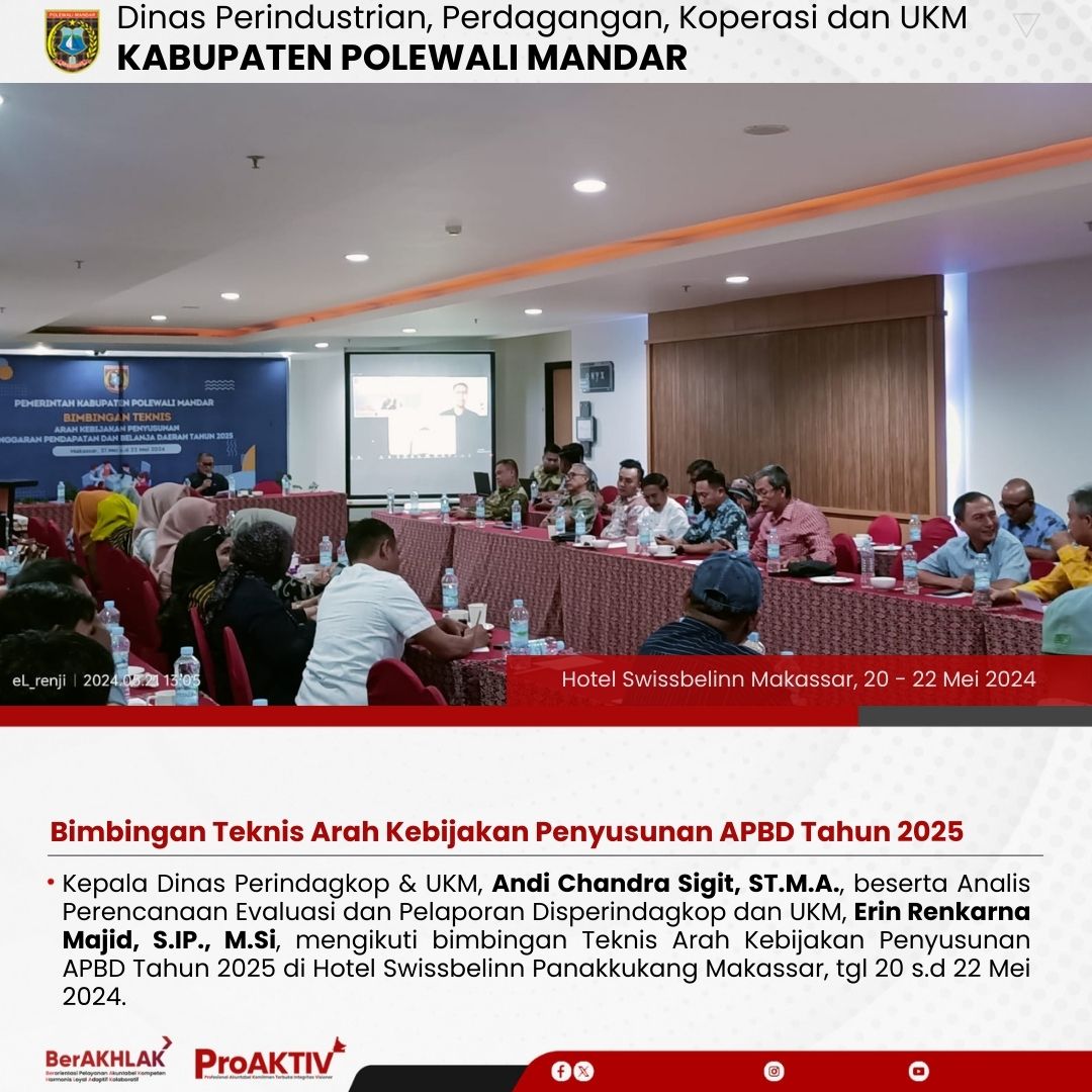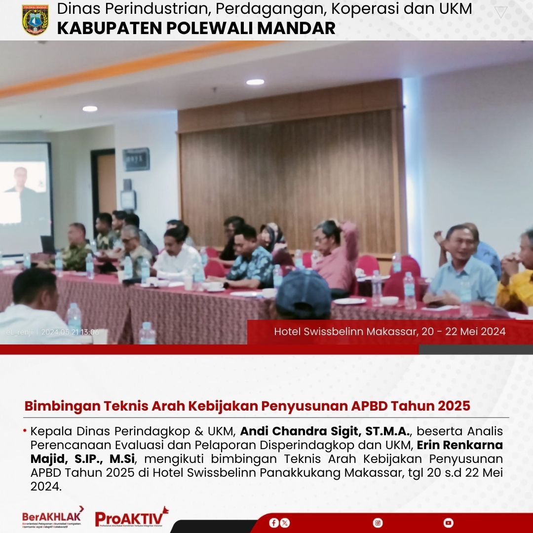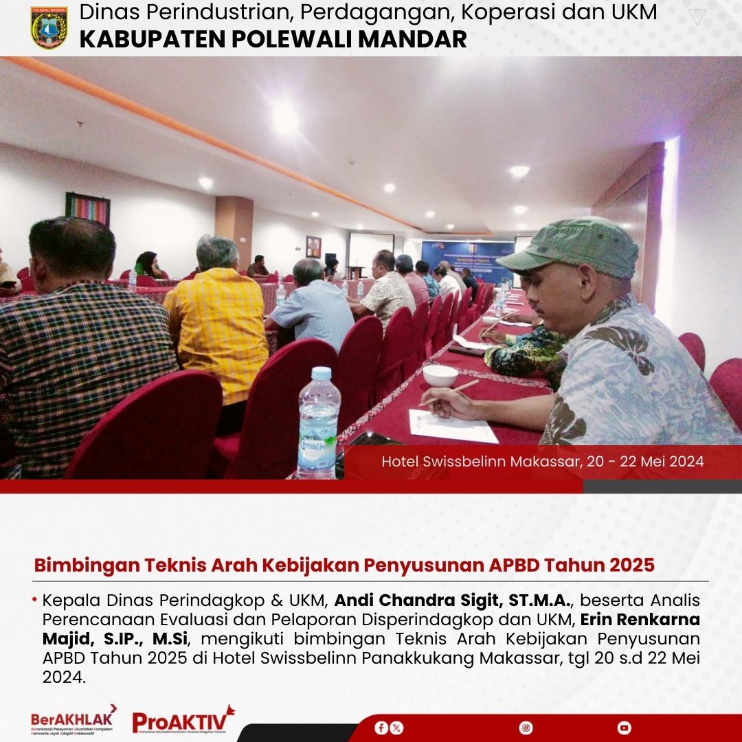 Kepala Dinas Perindustrian, Perdagangan, Koperasi dan UKM Kabupaten Polewali Mandar, Andi Chandra Sigit, ST., M.A.P beserta Kepala Bidang Koperasi, Nabil Wijdan Al Hamdani, S.STP. M.Si menghadiri undangan Rapat Konsolidasi Koperasi Desa Merah Putih yang berlangsung di Hotel Maleo pada tanggal 6 hingga 8 November 2025. Kegiatan ini dilaksanakan dalam rangka memperkuat koordinasi dan sinergitas antar lembaga dalam pengembangan sektor koperasi dan usaha kecil menengah di daerah....