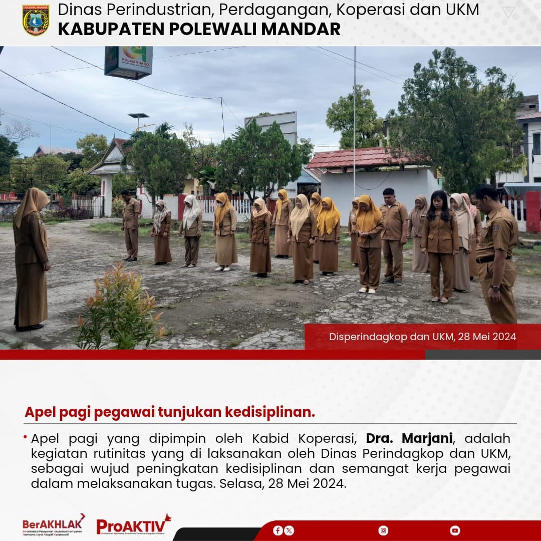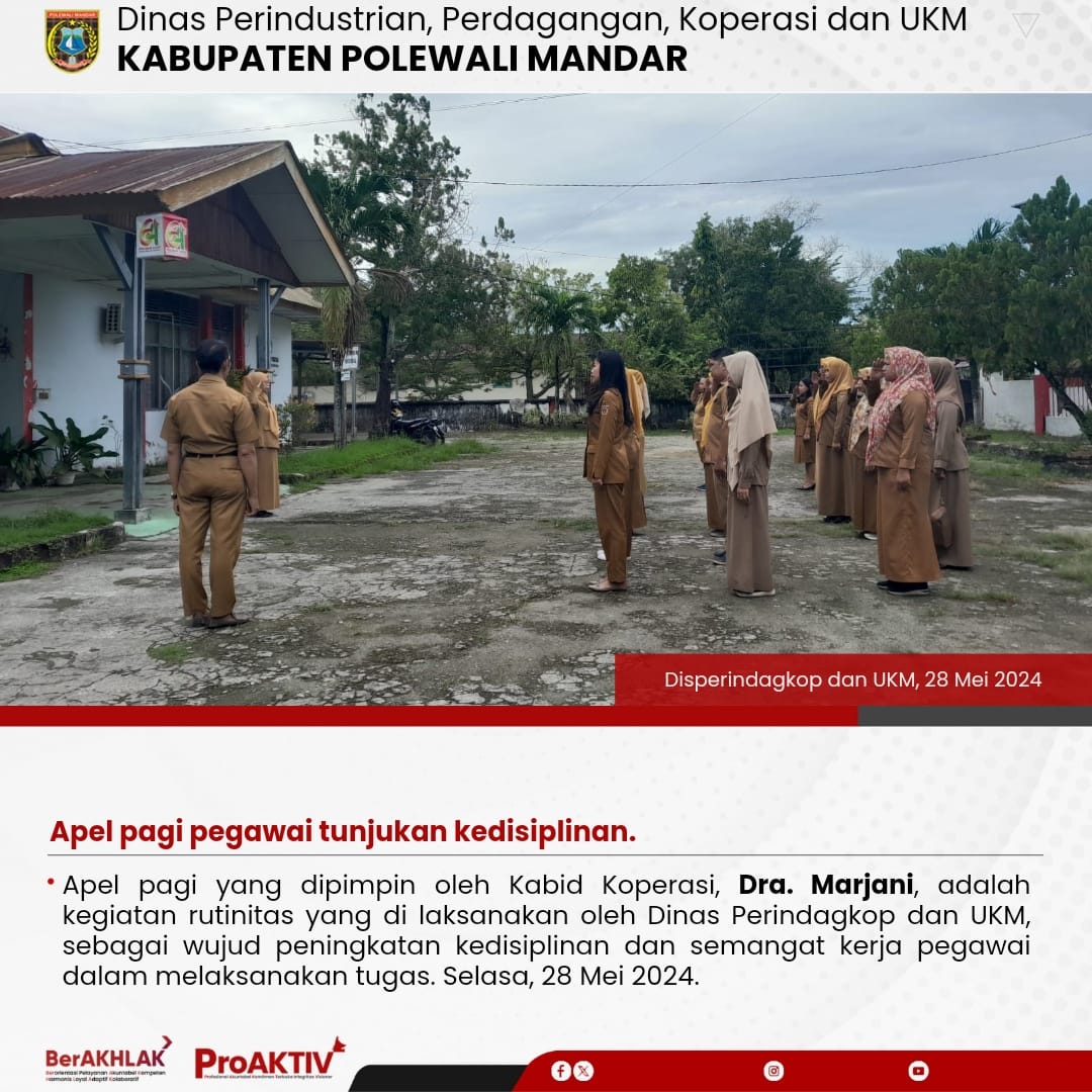 Dinas Perindustrian, Perdagangan, Koperasi dan UKM Kabupaten Polewali Mandar kembali menggelar kegiatan Jumat Bersih pada hari ini. Seluruh pejabat struktural, staf, hingga pegawai non-ASN terlibat aktif dalam menjaga kebersihan lingkungan kantor. Jumat, 07 November 2025...