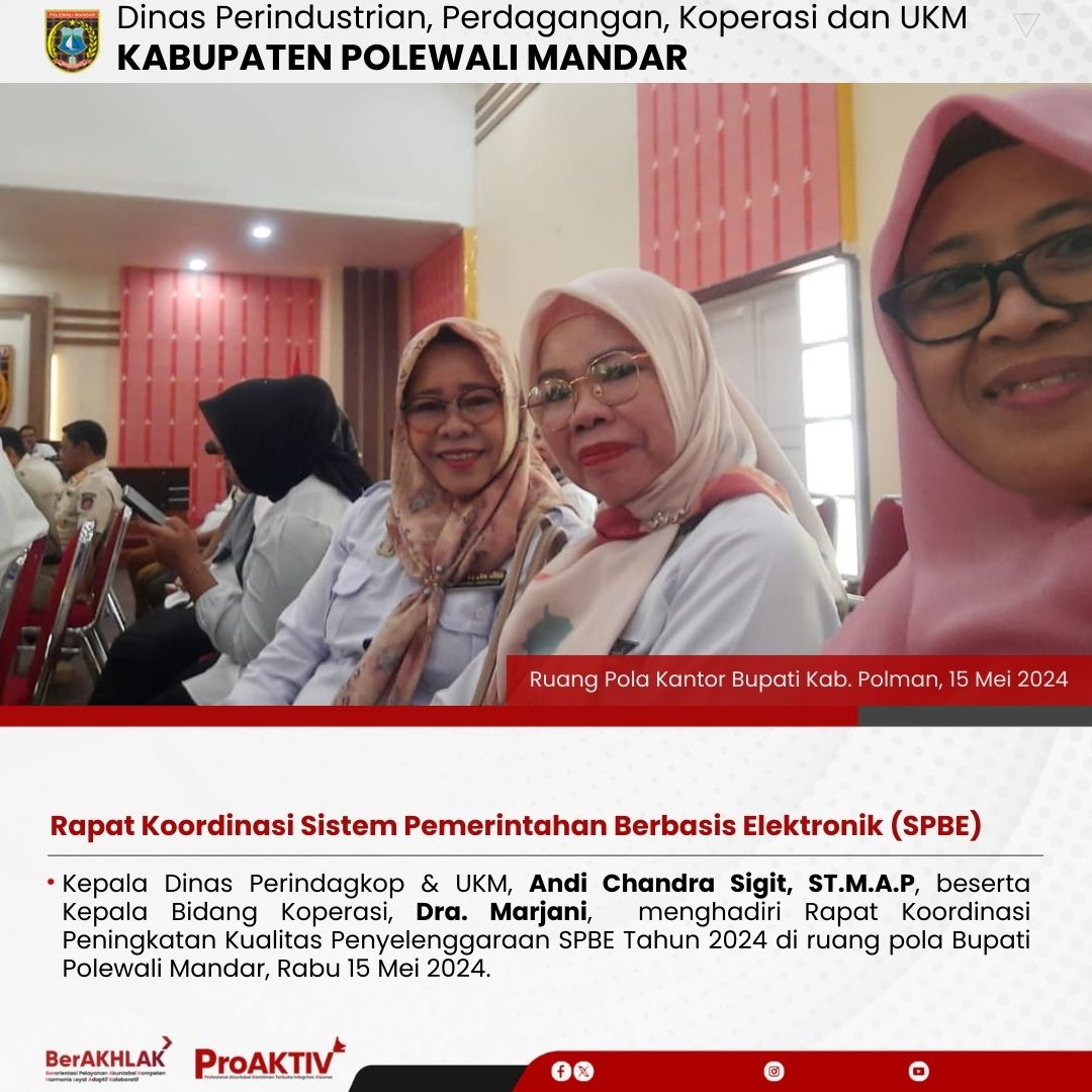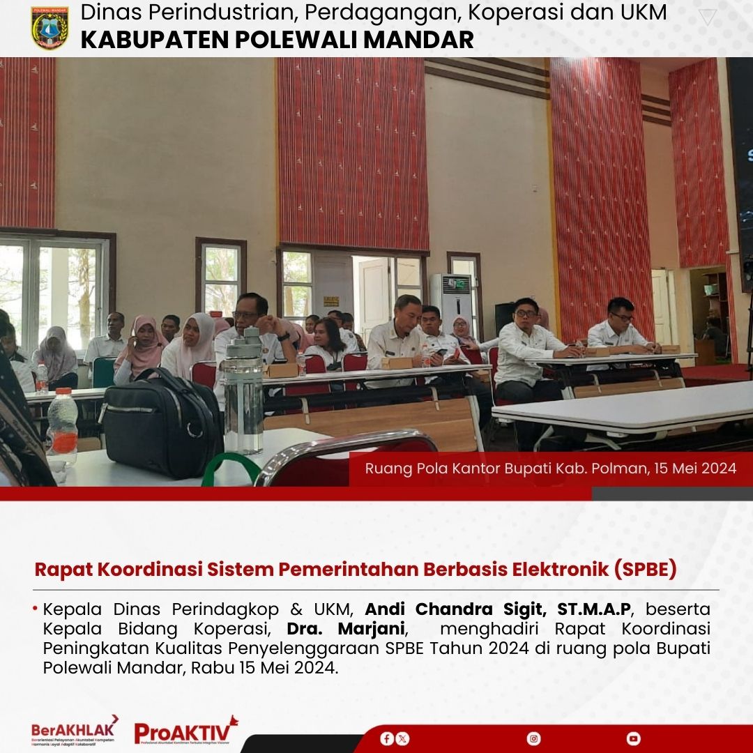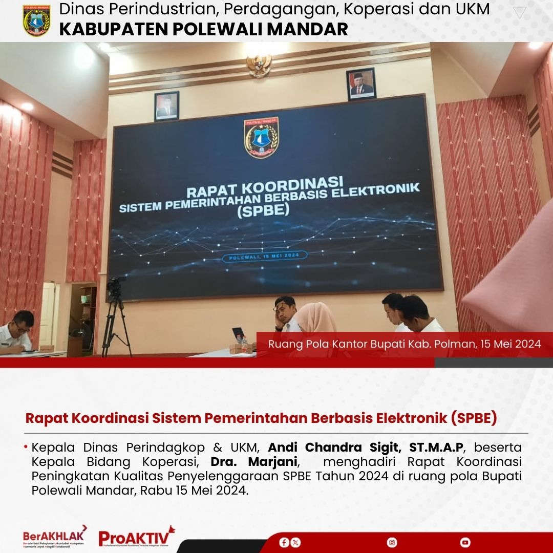 Polewali, Warta Dinas Perindagkop dan UKM Polman – Kepala Dinas Perindustrian, Perdagangan, Koperasi dan UKM, Andi Chandra Sigit, ST., M.AP bersama Kepala Bidang Koperasi dan UKM, Dra. Marjani menghadiri Rapat Koordinasi Peningkatan Kualitas Penyelenggaraan SPBE Tahun 2024 yang dilaksanakan oleh Dinas Komunikasi Informasi Statistik dan Persandian Kabupaten Polewali Mandar dalam rangka menindaklanjuti Laporan Hasil Pemantauan Penyelenggaraan Sistem Pemerintahan Berbasis Elektronik (SPBE) Pemerintah Kabupaten Polewali Mandar 2023 yang dilaksanakan di Ruang Pola Kantor Bupati Polewali Mandar, pada hari rabu, 15 Mei 2024.