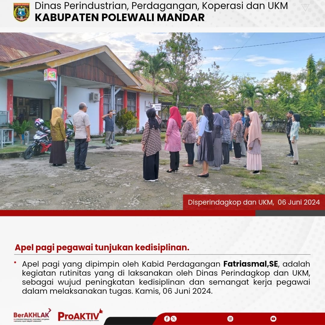Apel pagi yang dipimpin oleh Kabid Perdagangan Fatriasmal,SE, adalah kegiatan rutinitas yang di laksanakan oleh Dinas Perindagkop dan UKM, sebagai wujud peningkatan kedisiplinan dan semangat kerja pegawai dalam melaksanakan tugas. Kamis, 06 Juni 2024.
