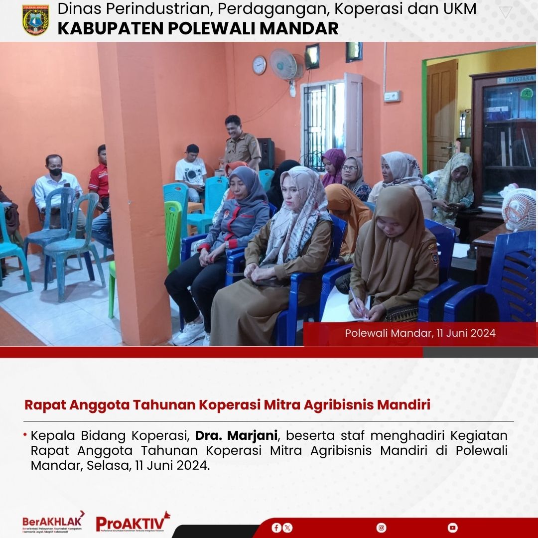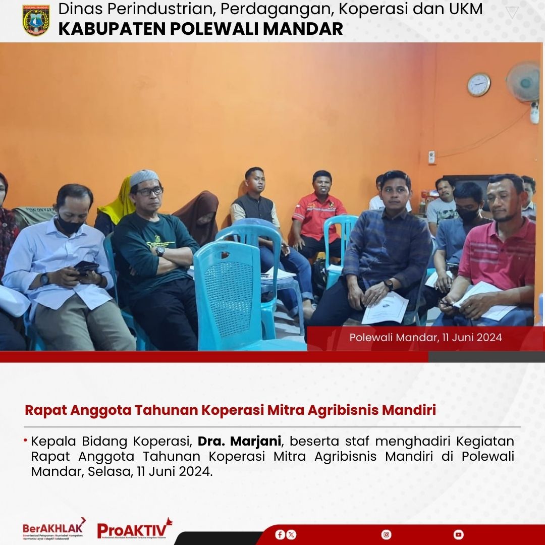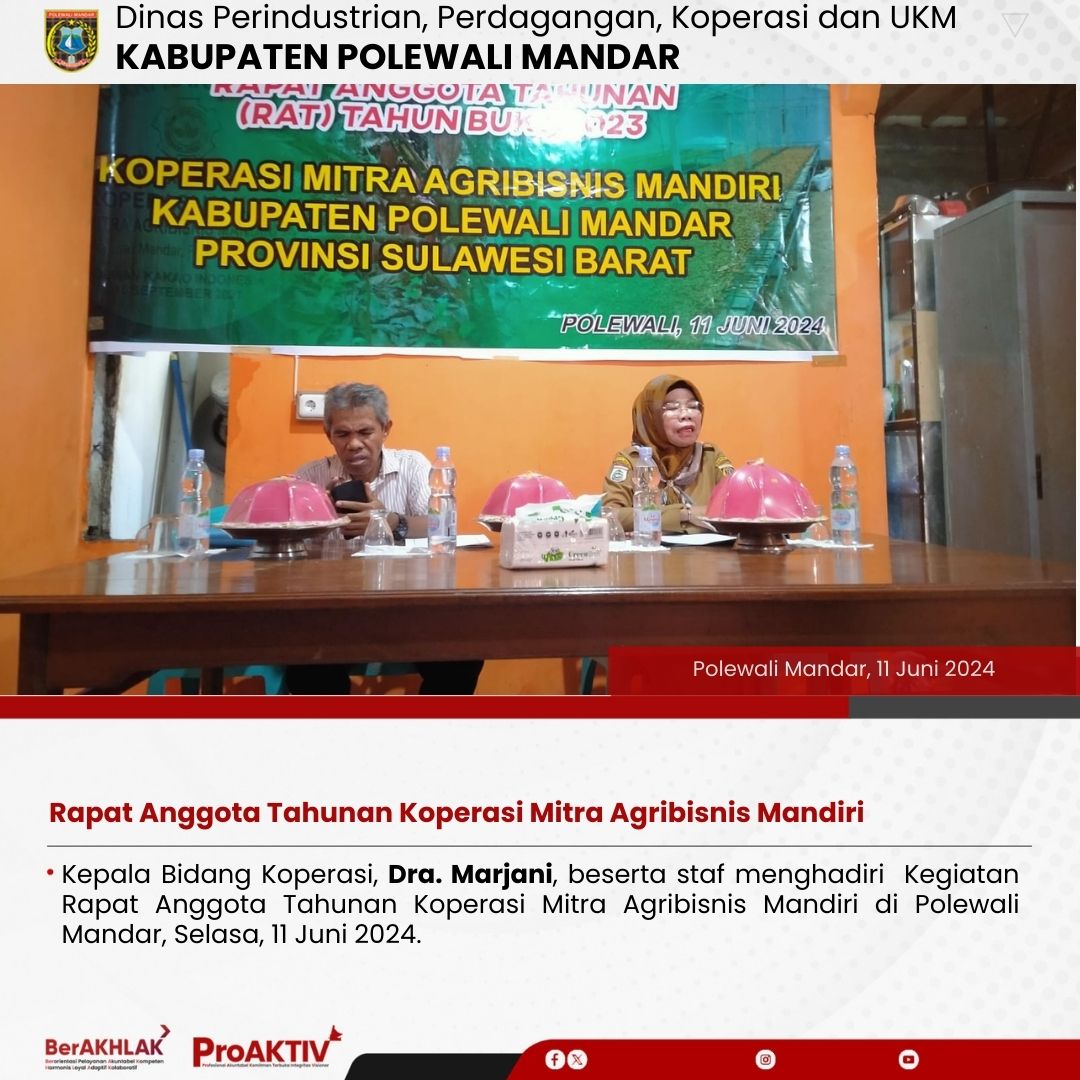 Kepala Bidang Koperasi, Dra. Marjani, beserta staf menghadiri Kegiatan Rapat Anggota Tahunan Koperasi Mitra Agribisnis Mandiri di Polewali Mandar, Selasa, 11 Juni 2024.