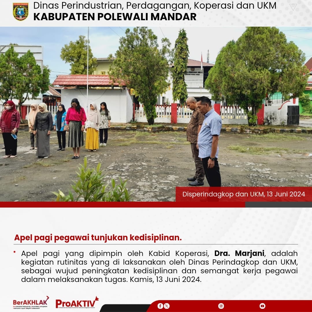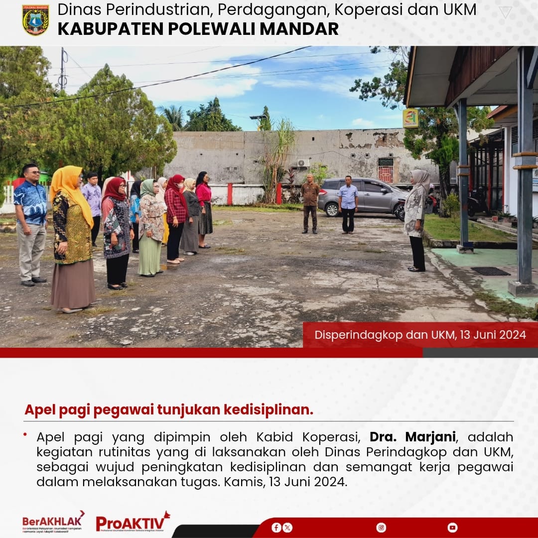 Apel pagi yang dipimpin oleh Kabid Koperasi, Dra. Marjani, adalah kegiatan rutinitas yang di laksanakan oleh Dinas Perindagkop dan UKM, sebagai wujud peningkatan kedisiplinan dan semangat kerja pegawai dalam melaksanakan tugas. Kamis, 13 Juni 2024.
