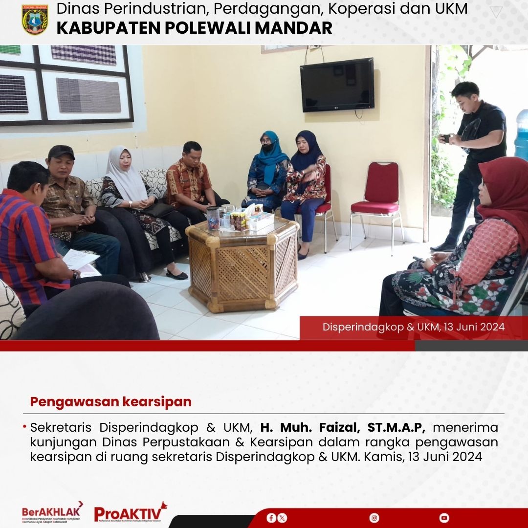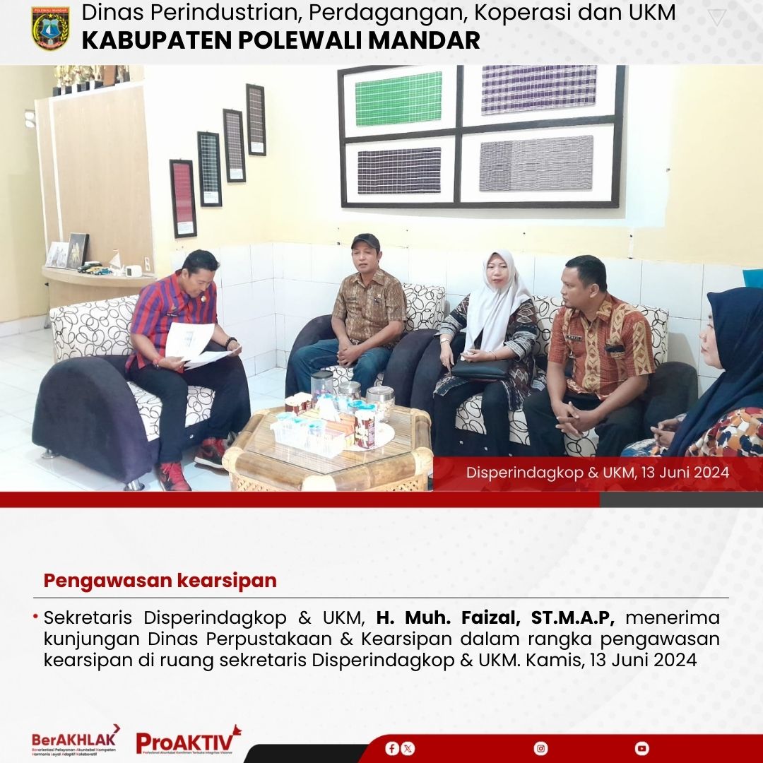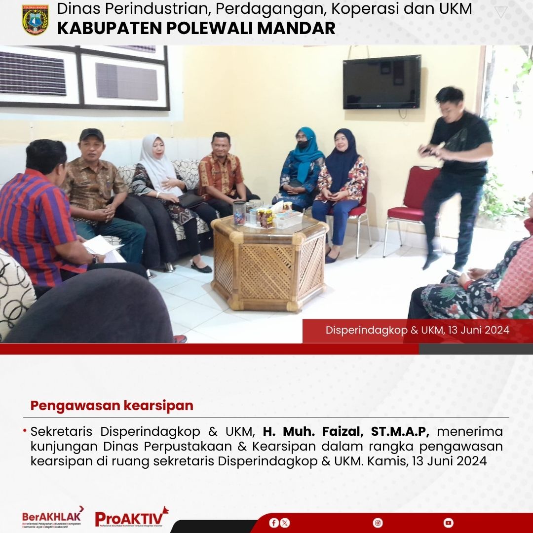 Sekretaris Disperindagkop & UKM, H. Muh. Faizal, ST.M.A.P, menerima kunjungan Dinas Perpustakaan & Kearsipan dalam rangka pengawasan kearsipan di ruang sekretaris Disperindagkop & UKM. Kamis, 13 Juni 2024