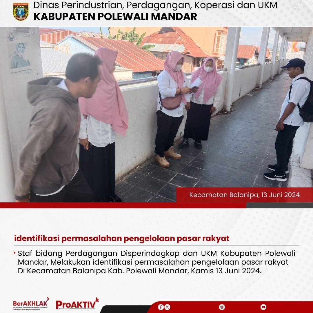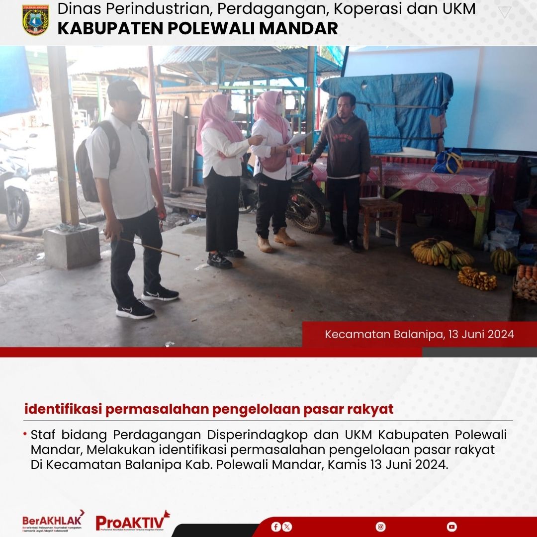 Staf bidang Perdagangan Disperindagkop dan UKM Kabupaten Polewali Mandar, Melakukan identifikasi permasalahan pengelolaan pasar rakyat di Kecamatan Balanipa Kab. Polewali Mandar, Kamis 13 Juni 2024.