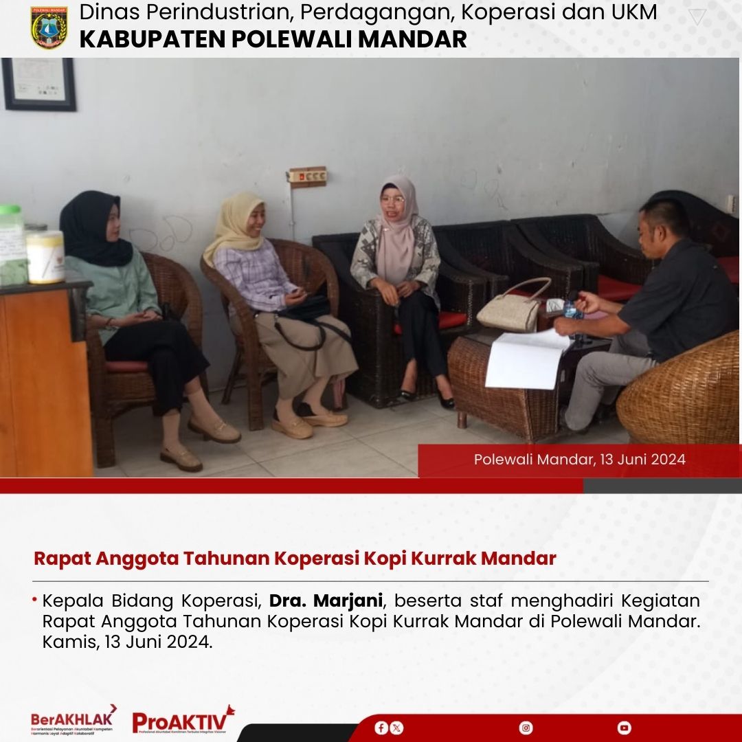 Kepala Bidang Koperasi, Dra. Marjani, beserta staf menghadiri Kegiatan Rapat Anggota Tahunan Koperasi Kopi Kurrak Mandar di Polewali Mandar. Kamis, 13 Juni 2024.