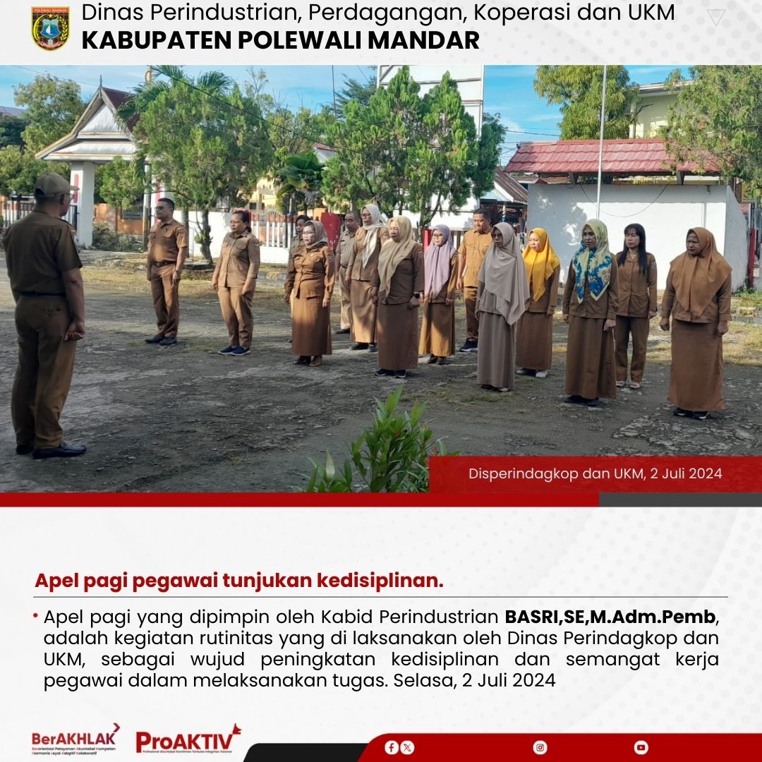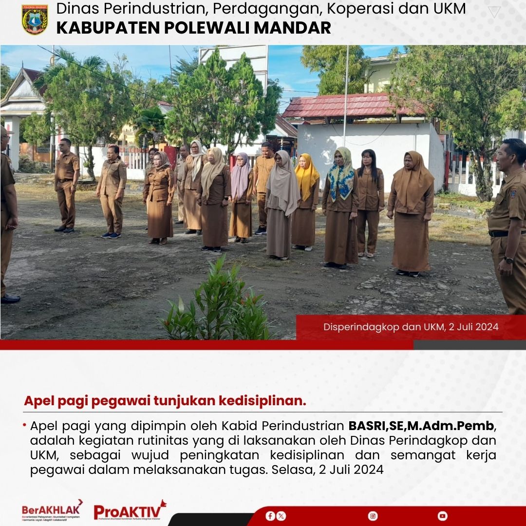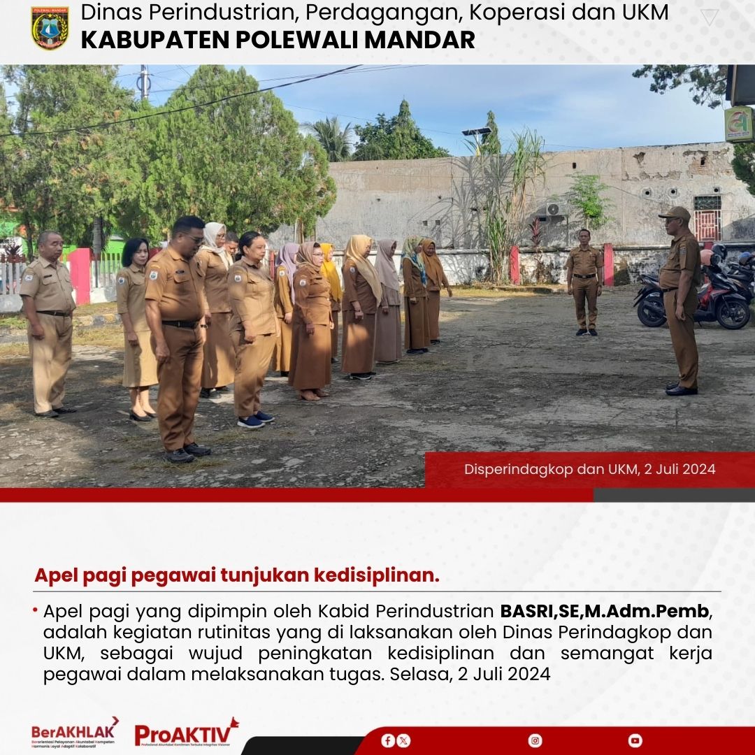 Apel pagi yang dipimpin oleh Kabid Perindustrian BASRI,SE,M.Adm.Pemb, adalah kegiatan rutinitas yang di laksanakan oleh Dinas Perindagkop dan UKM, sebagai wujud peningkatan kedisiplinan dan semangat kerja pegawai dalam melaksanakan tugas. Selasa, 2 Juli 2024