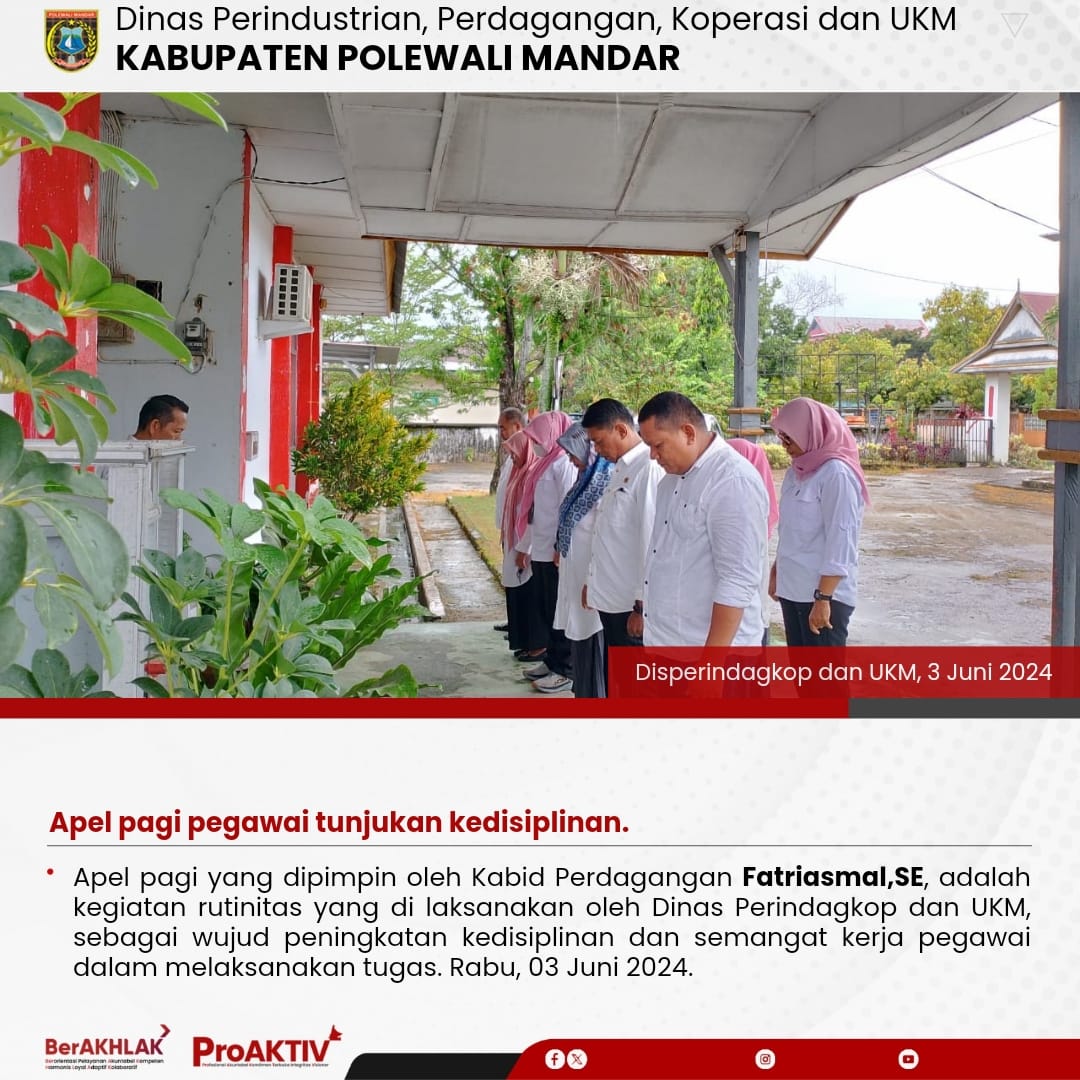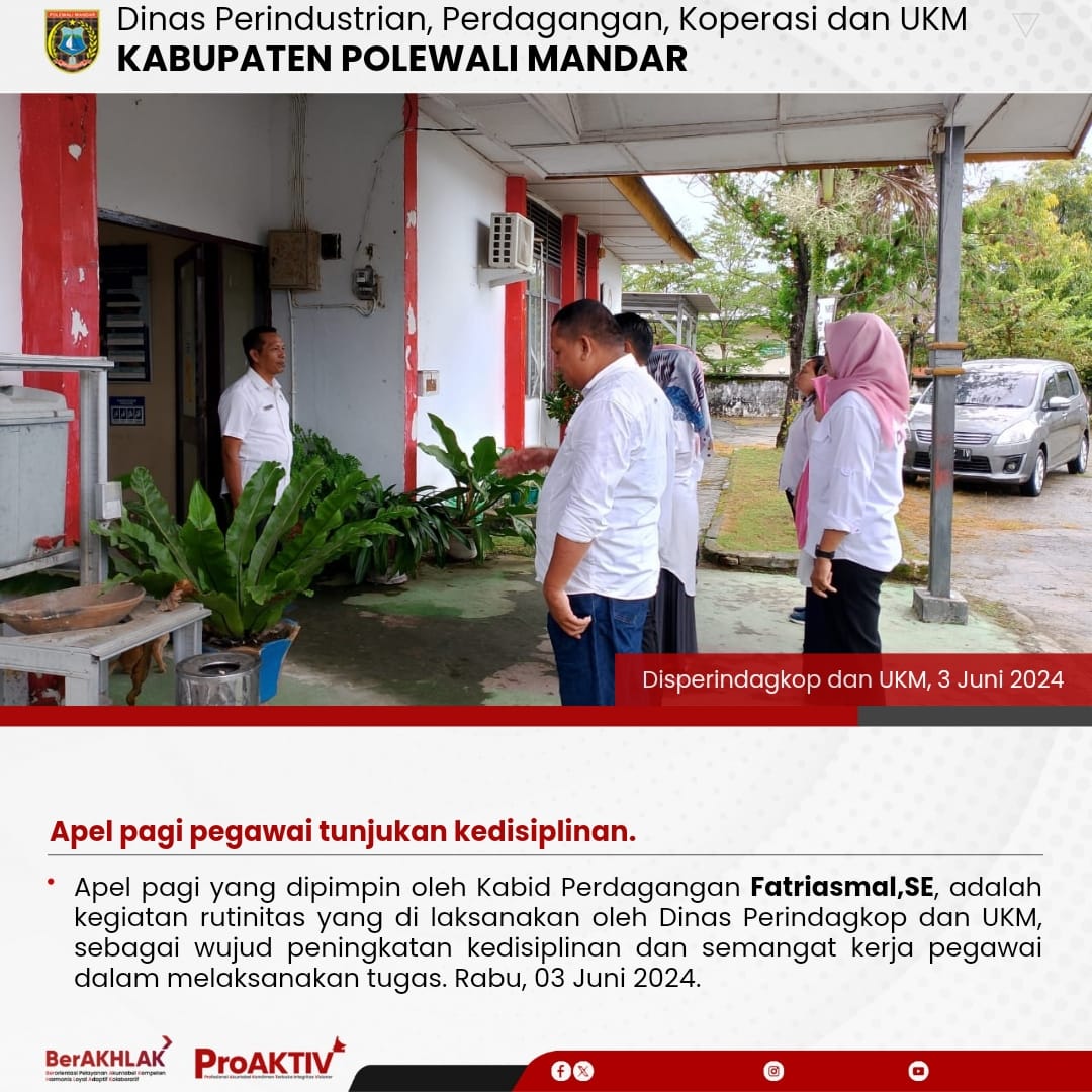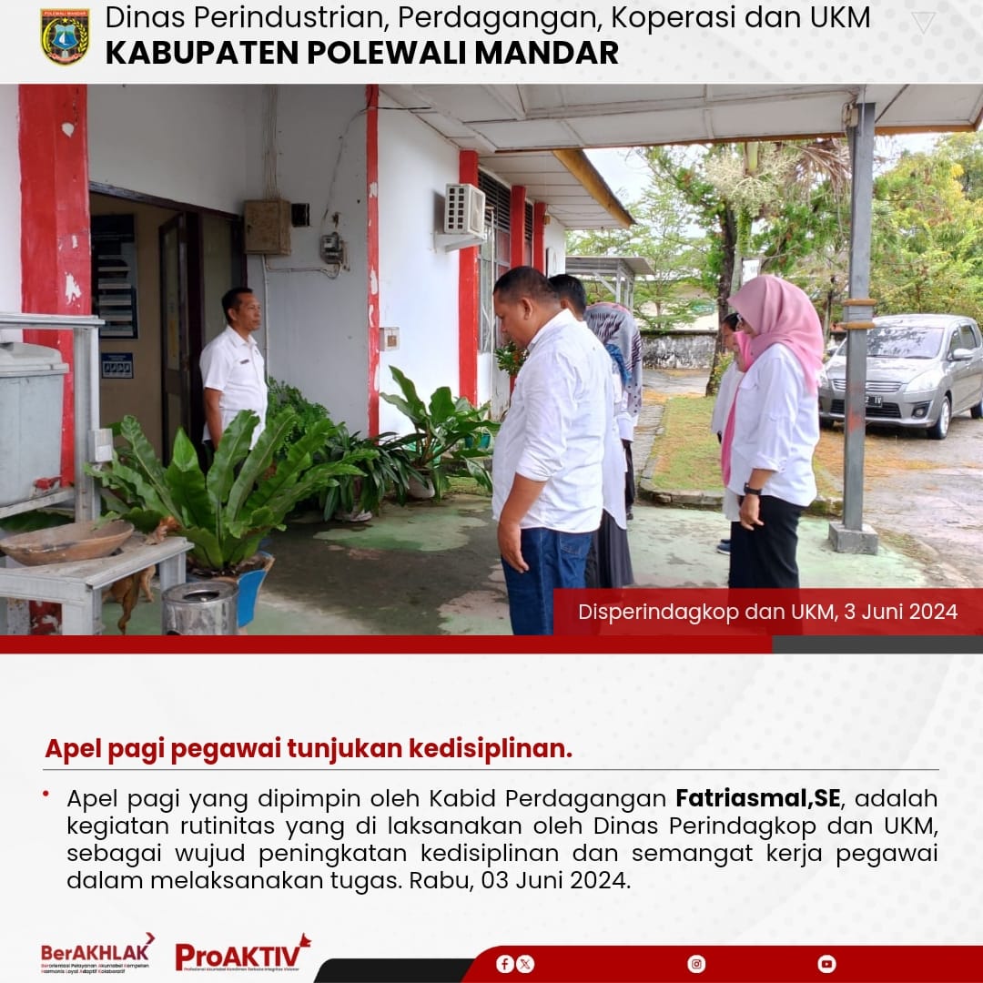 Apel pagi yang dipimpin oleh Kabid Perdagangan Fatriasmal,SE, adalah kegiatan rutinitas yang di laksanakan oleh Dinas Perindagkop dan UKM, sebagai wujud peningkatan kedisiplinan dan semangat kerja pegawai dalam melaksanakan tugas. Rabu, 03 Juni 2024.