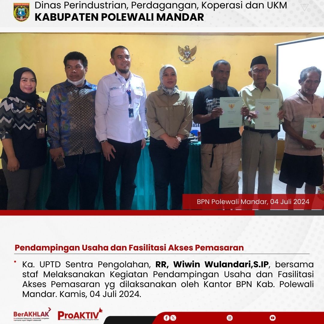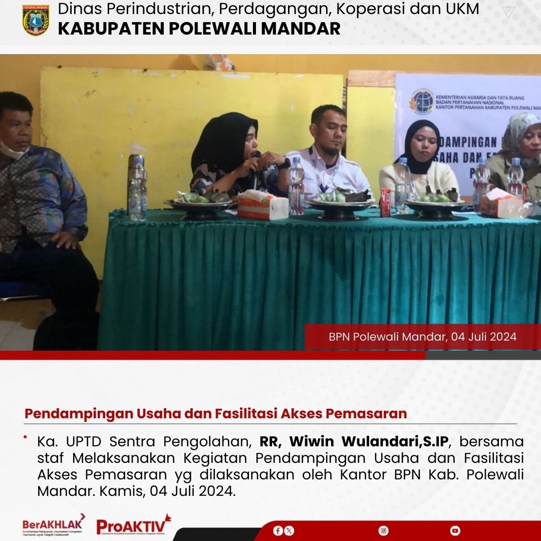 Ka. UPTD Sentra Pengolahan, RR, Wiwin Wulandari,S.IP, bersama staf Melaksanakan Kegiatan Pendampingan Usaha dan Fasilitasi Akses Pemasaran yg dilaksanakan oleh Kantor BPN Kab. Polewali Mandar. Kamis, 04 Juli 2024.