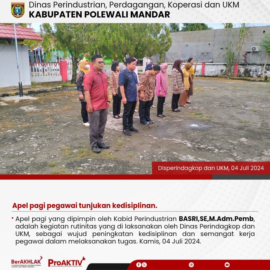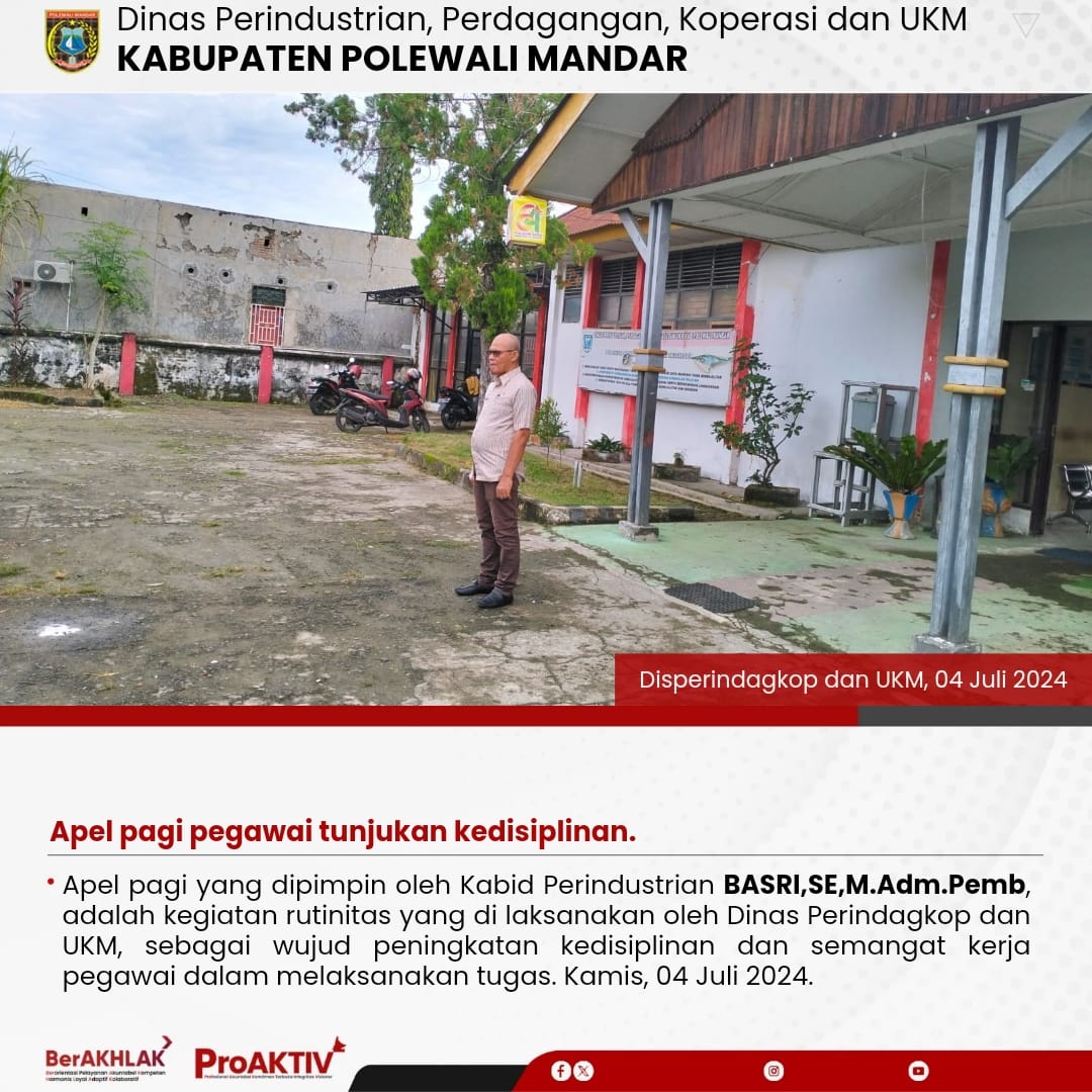 Apel pagi yang dipimpin oleh Kabid Perindustrian BASRI,SE,M.Adm.Pemb, adalah kegiatan rutinitas yang di laksanakan oleh Dinas Perindagkop dan UKM, sebagai wujud peningkatan kedisiplinan dan semangat kerja pegawai dalam melaksanakan tugas. Kamis, 04 Juli 2024.