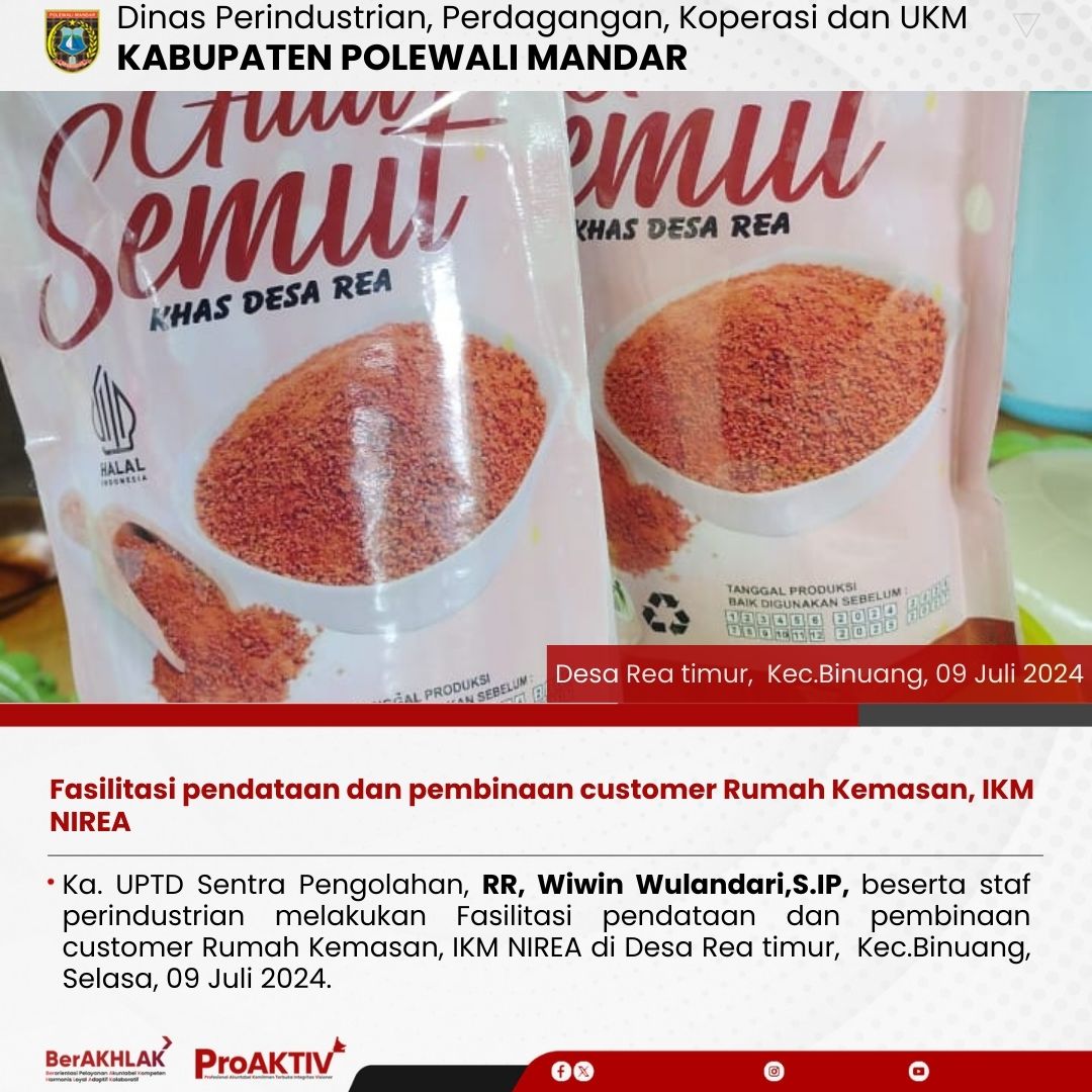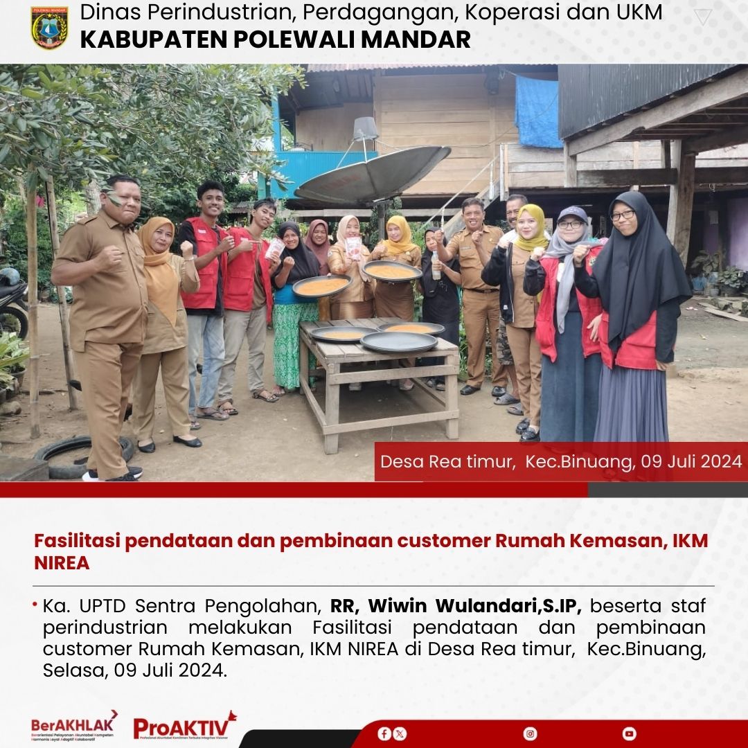 Ka. UPTD Sentra Pengolahan, RR, Wiwin Wulandari,S.IP, beserta staf perindustrian melakukan Fasilitasi pendataan dan pembinaan customer Rumah Kemasan, IKM NIREA di Desa Rea timur, Kec.Binuang, Selasa, 09 Juli 2024.