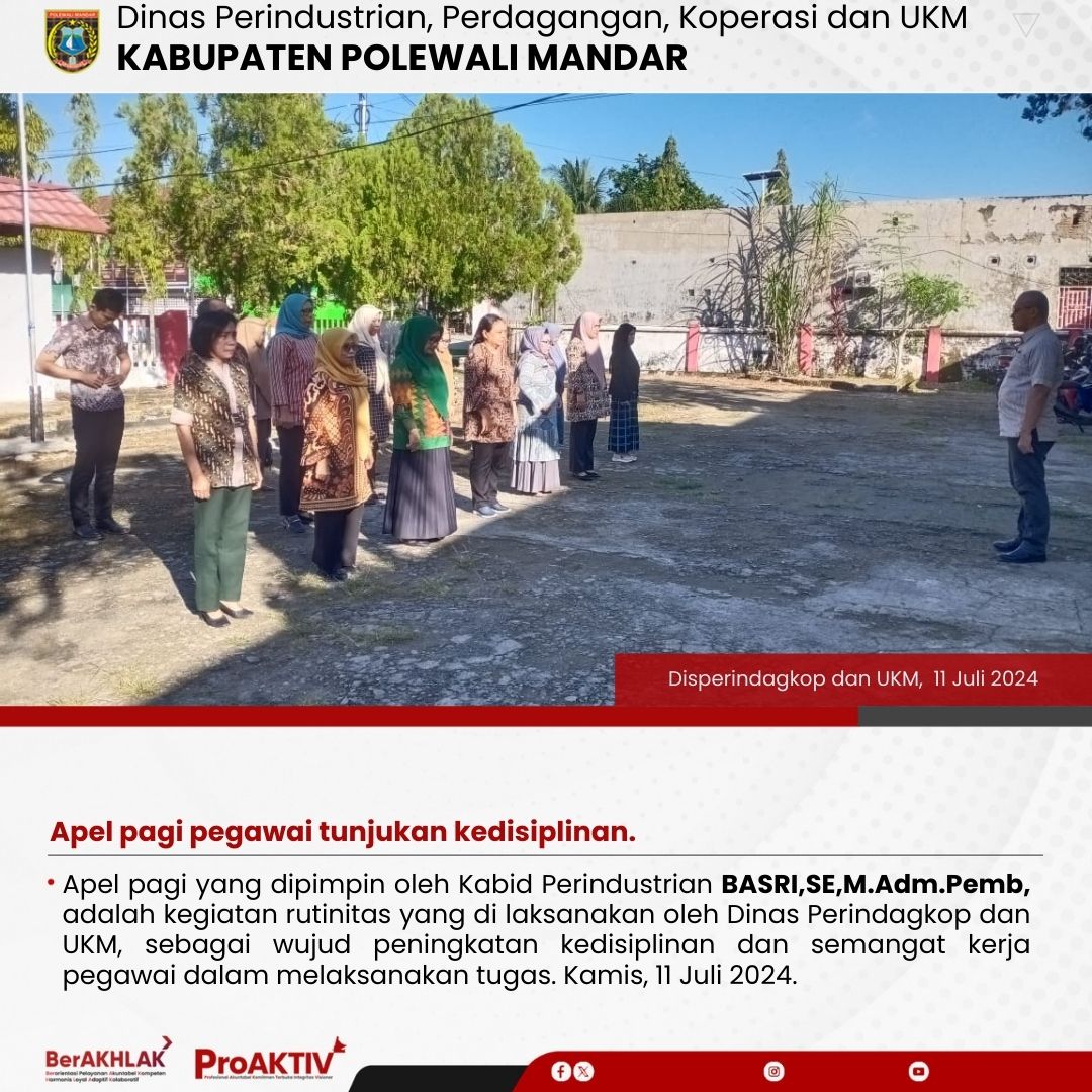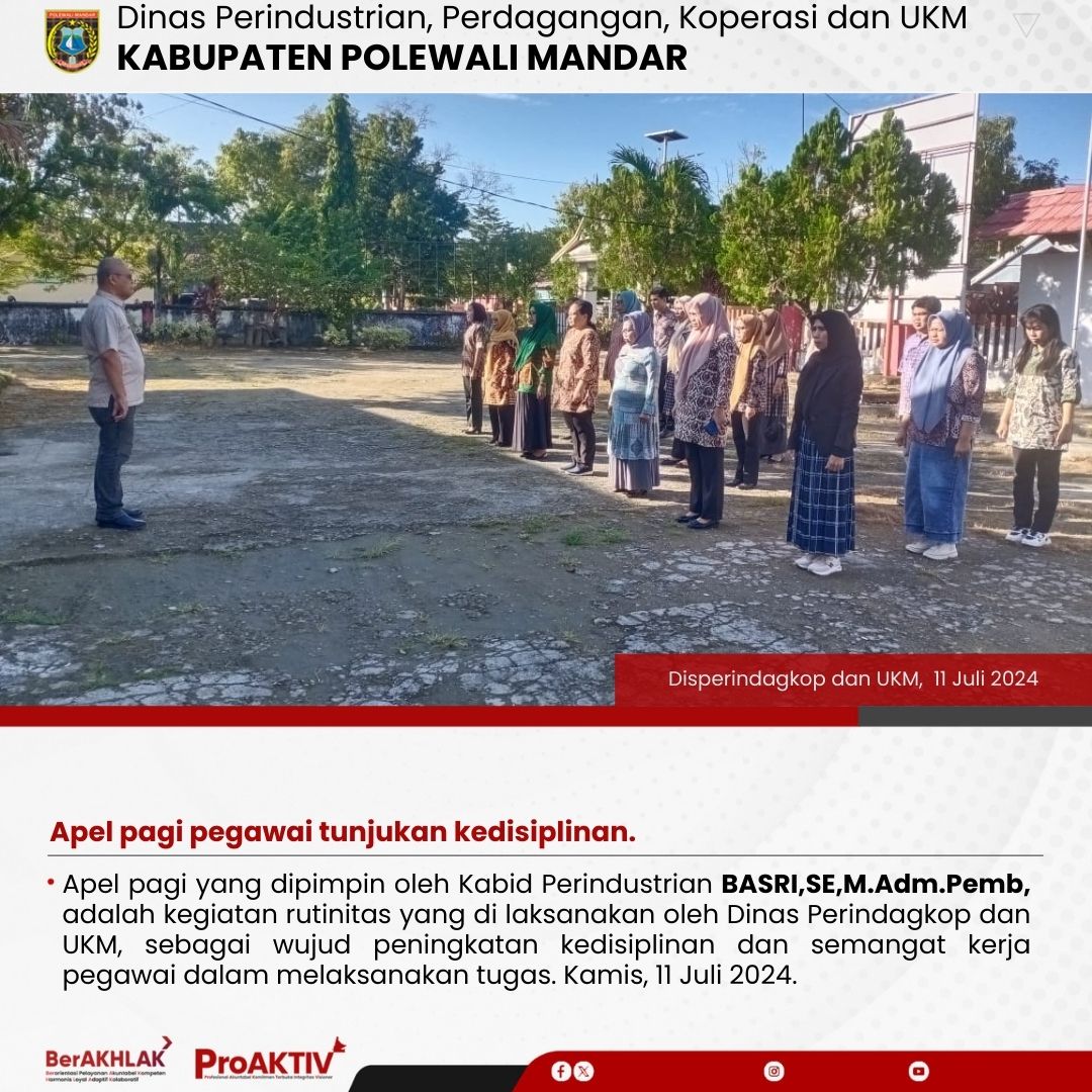 Apel pagi yang dipimpin oleh Kabid Perindustrian BASRI,SE,M.Adm.Pemb, adalah kegiatan rutinitas yang di laksanakan oleh Dinas Perindagkop dan UKM, sebagai wujud peningkatan kedisiplinan dan semangat kerja pegawai dalam melaksanakan tugas. Kamis, 11 Juli 2024.