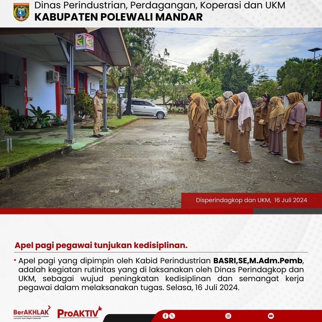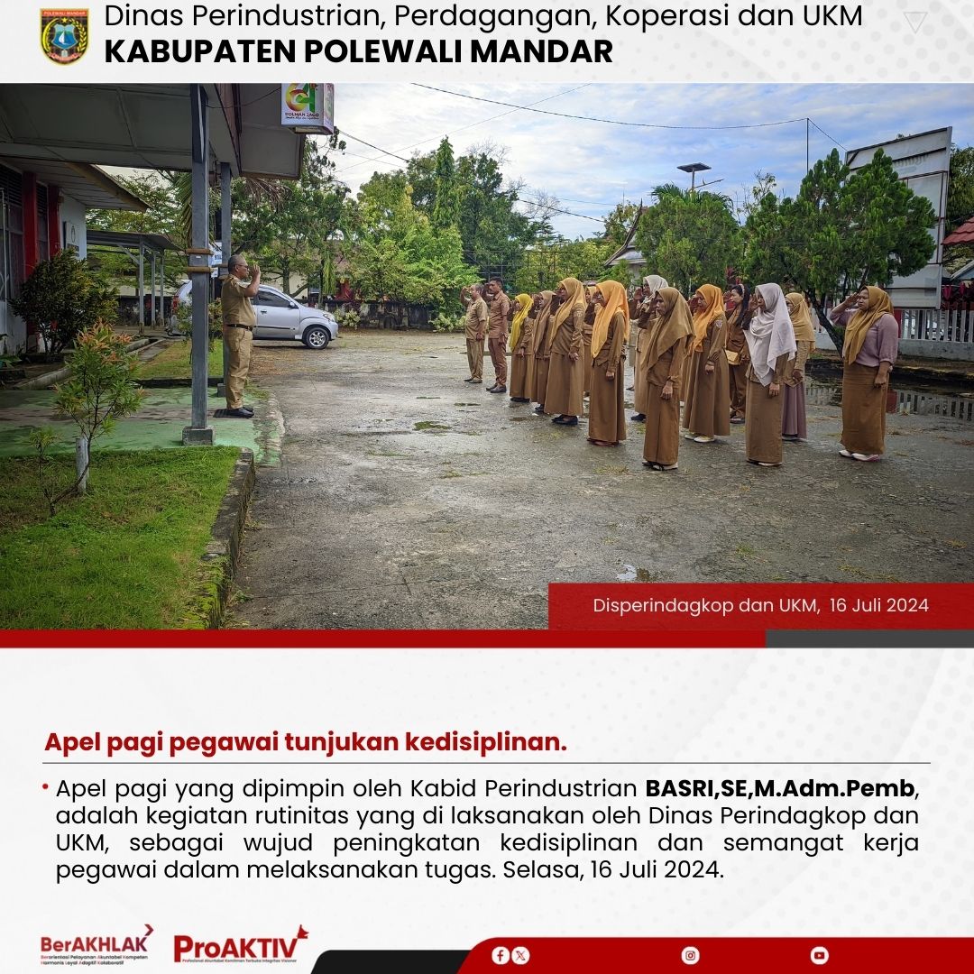 Apel pagi yang dipimpin oleh Kabid Perindustrian BASRI,SE,M.Adm.Pemb, adalah kegiatan rutinitas yang di laksanakan oleh Dinas Perindagkop dan UKM, sebagai wujud peningkatan kedisiplinan dan semangat kerja pegawai dalam melaksanakan tugas. Selasa, 16 Juli 2024.