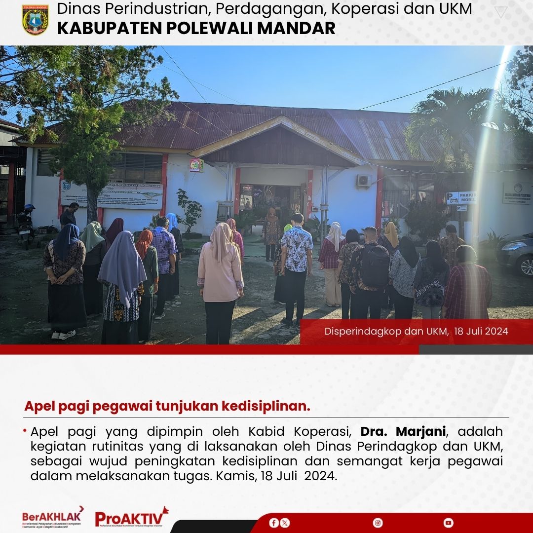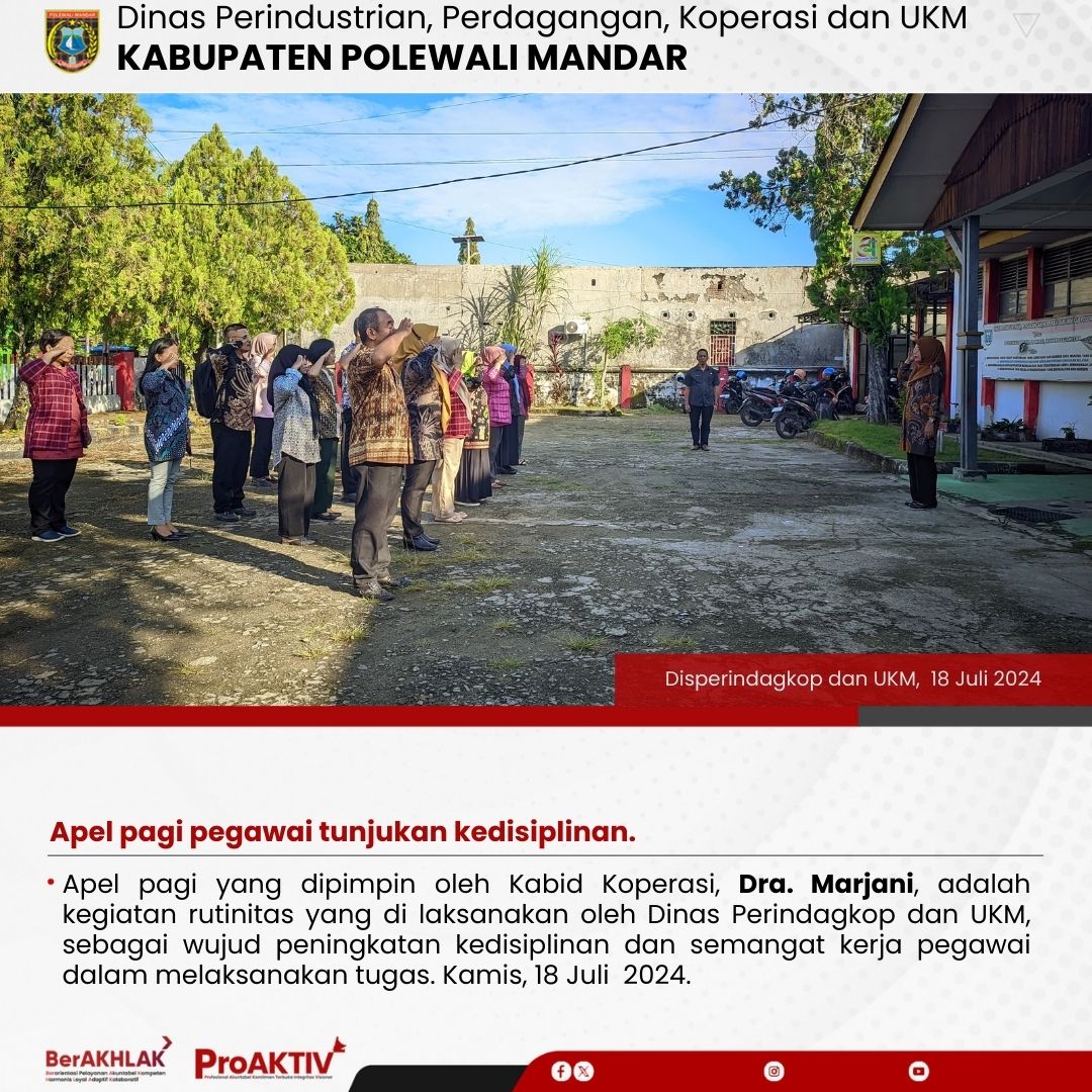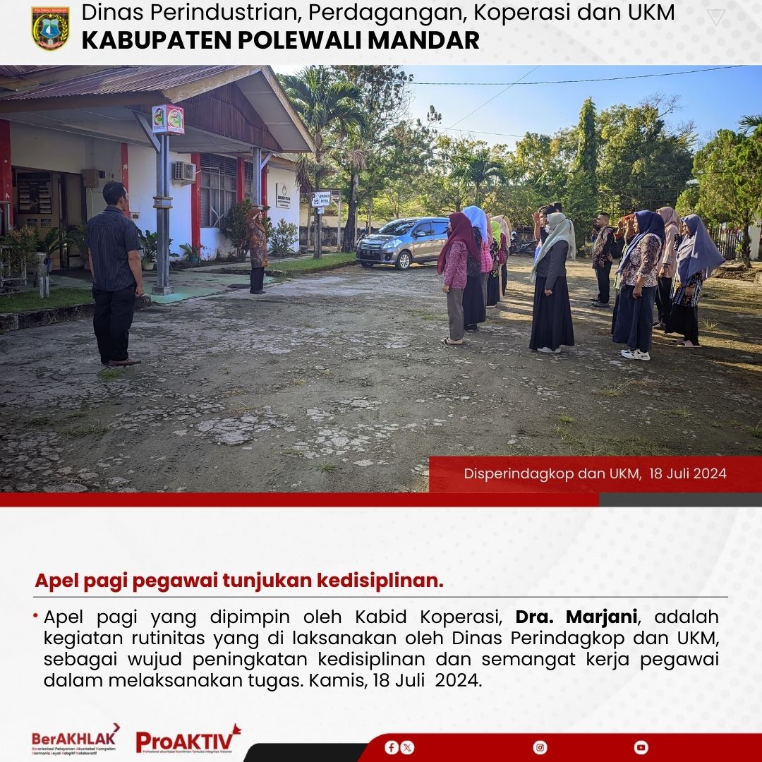 Apel pagi yang dipimpin oleh Kabid Koperasi, Dra. Marjani, adalah kegiatan rutinitas yang di laksanakan oleh Dinas Perindagkop dan UKM, sebagai wujud peningkatan kedisiplinan dan semangat kerja pegawai dalam melaksanakan tugas. Kamis, 18 Juli 2024.