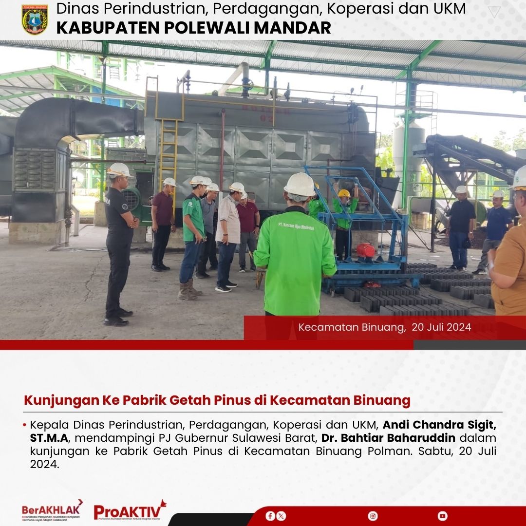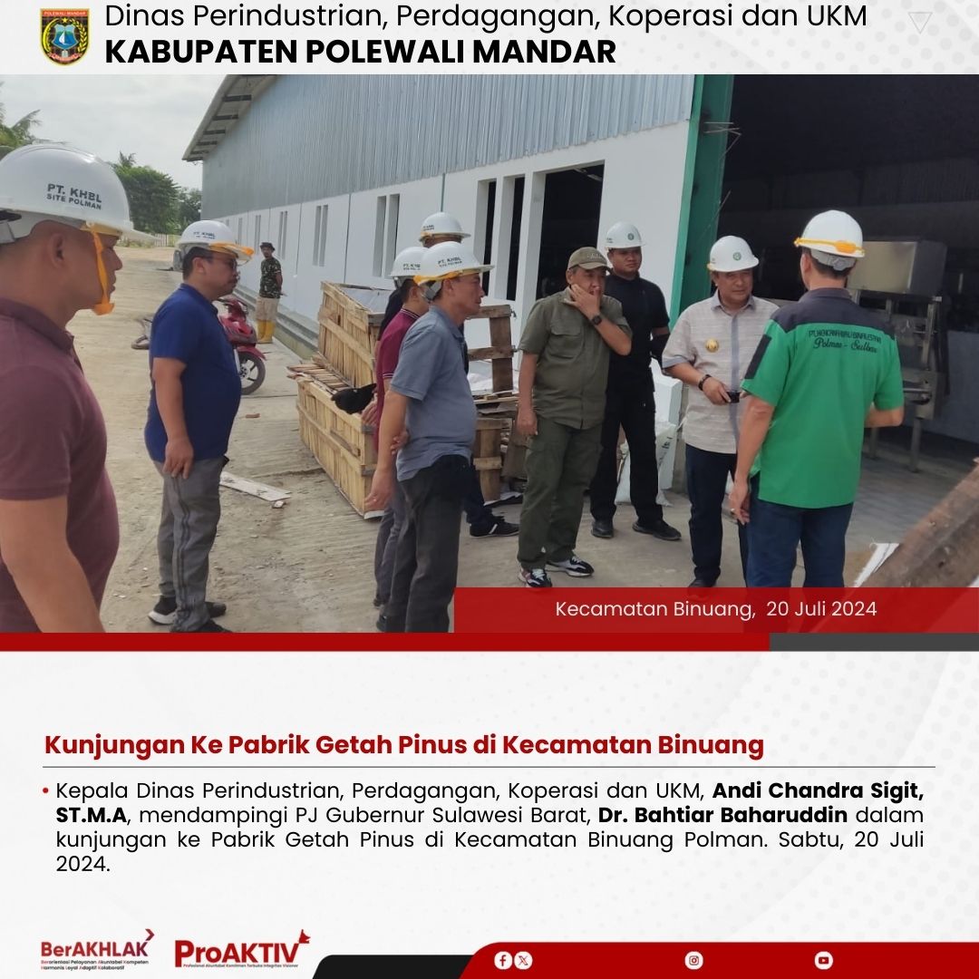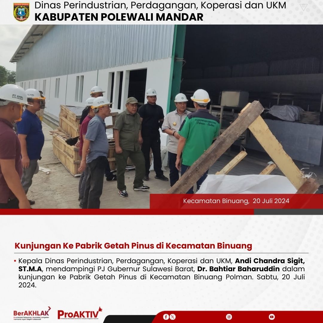 Kepala Dinas Perindustrian, Perdagangan, Koperasi dan UKM, Andi Chandra Sigit, ST.M.A, mendampingi PJ Gubernur Sulawesi Barat, Dr. Bahtiar Baharuddin dalam kunjungan ke Pabrik Getah Pinus di Kecamatan Binuang Polman. Sabtu, 20 Juli 2024.