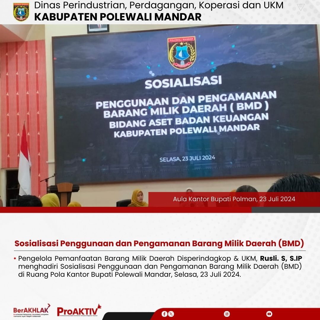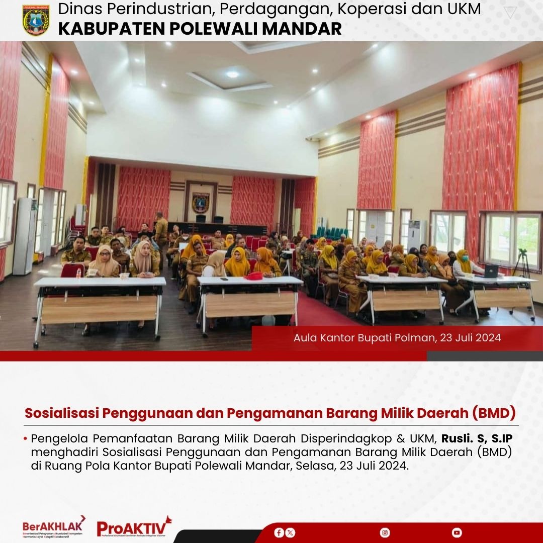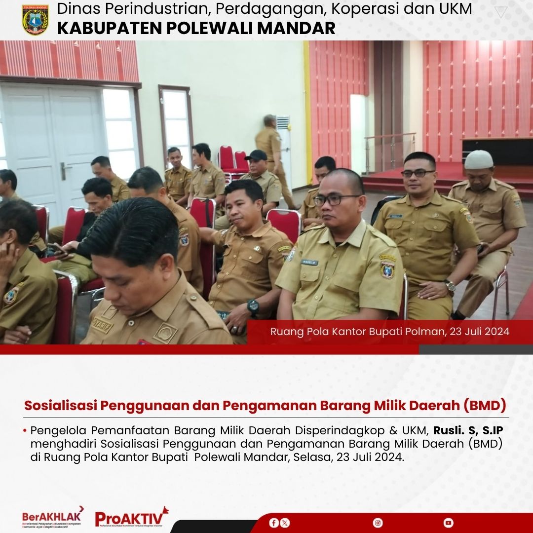 Pengelola Pemanfaatan Barang Milik Daerah Disperindagkop & UKM, Rusli. S, S.IP menghadiri Sosialisasi Penggunaan dan Pengamanan Barang Milik Daerah (BMD) di Ruang Pola Kantor Bupati Polewali Mandar, Selasa, 23 Juli 2024.