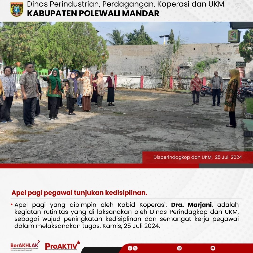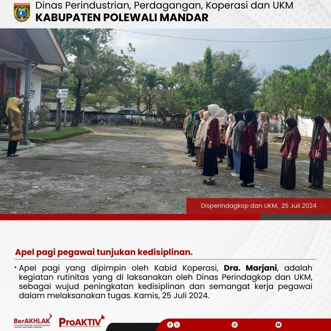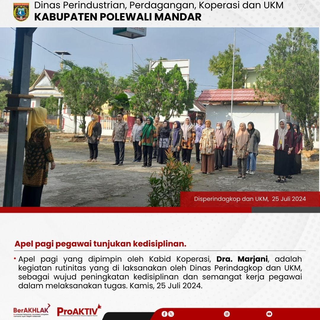 Apel pagi yang dipimpin oleh Kabid Koperasi, Dra. Marjani, adalah kegiatan rutinitas yang di laksanakan oleh Dinas Perindagkop dan UKM, sebagai wujud peningkatan kedisiplinan dan semangat kerja pegawai dalam melaksanakan tugas. Kamis, 25 Juli 2024.