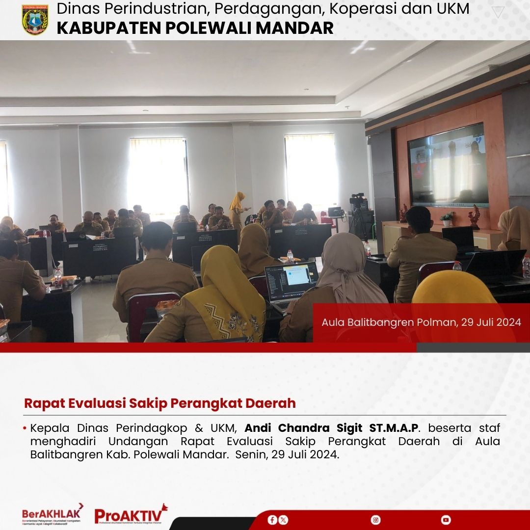 Kepala Dinas Perindagkop & UKM, Andi Chandra Sigit ST.M.A.P. beserta staf menghadiri Undangan Rapat Evaluasi Sakip Perangkat Daerah di Aula Balitbangren Kab. Polewali Mandar. Senin, 29 Juli 2024.