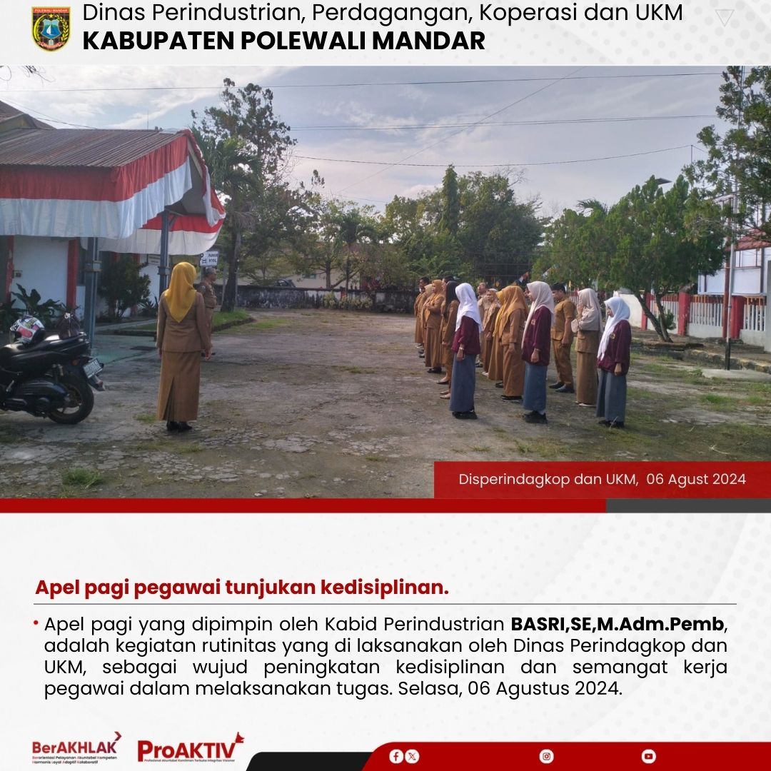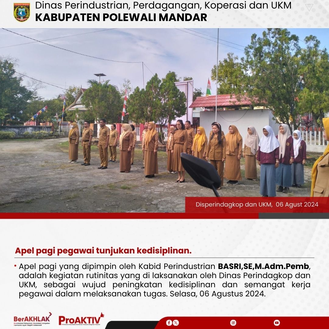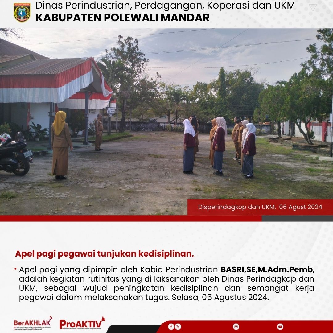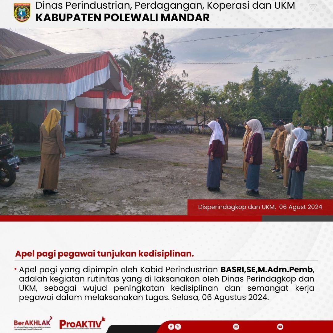 Apel pagi yang dipimpin oleh Kabid Perindustrian BASRI,SE,M.Adm.Pemb, adalah kegiatan rutinitas yang di laksanakan oleh Dinas Perindagkop dan UKM, sebagai wujud peningkatan kedisiplinan dan semangat kerja pegawai dalam melaksanakan tugas. Selasa, 06 Agustus 2024.