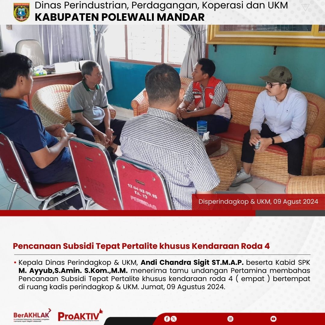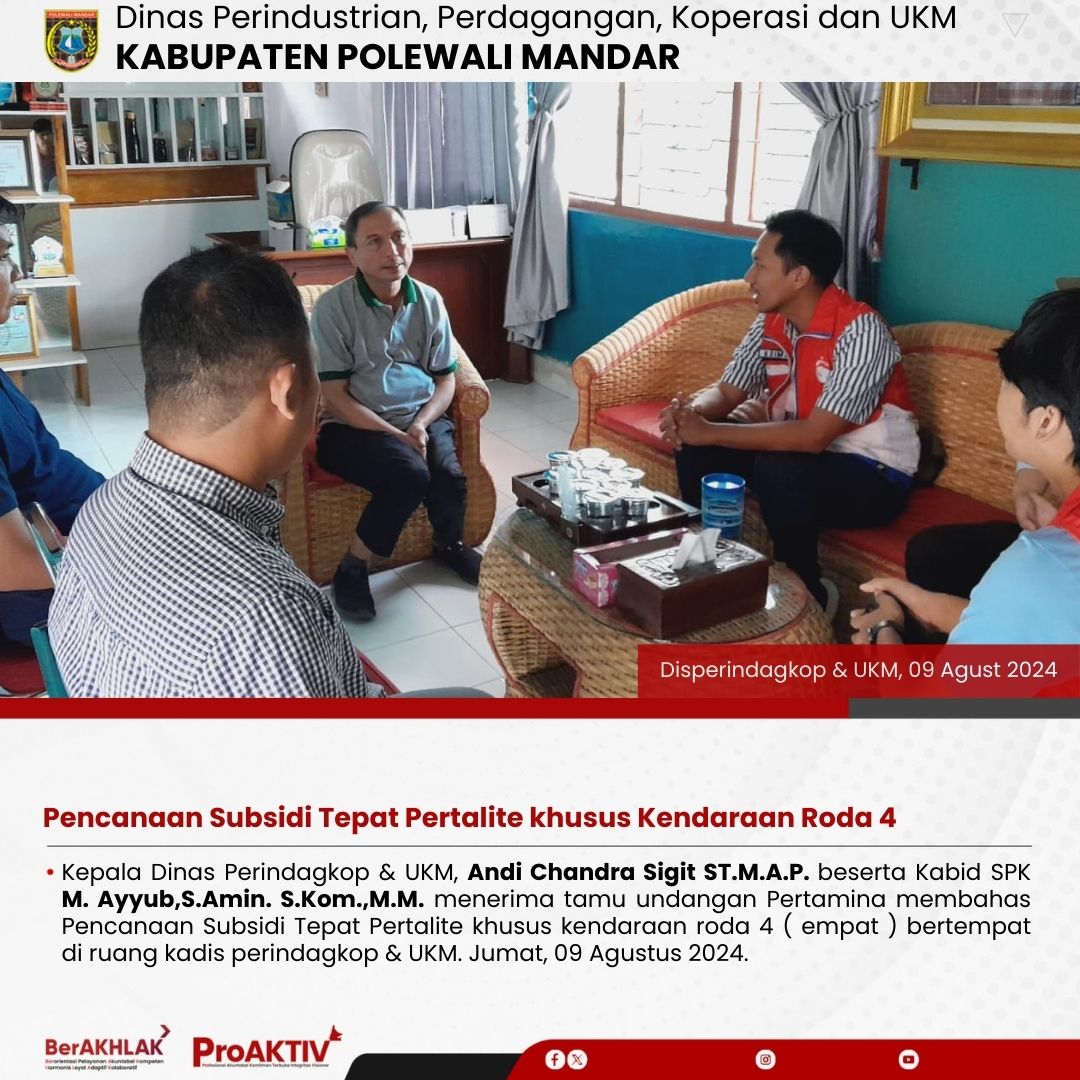 Kepala Dinas Perindagkop & UKM, Andi Chandra Sigit ST.M.A.P. beserta Kabid SPK M. Ayyub,S.Amin. S.Kom.,M.M. menerima tamu undangan Pertamina membahas Pencanaan Subsidi Tepat Pertalite khusus kendaraan roda 4 ( empat ) bertempat di ruang kadis perindagkop & UKM. Jumat, 09 Agustus 2024.