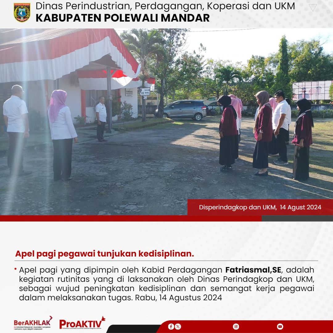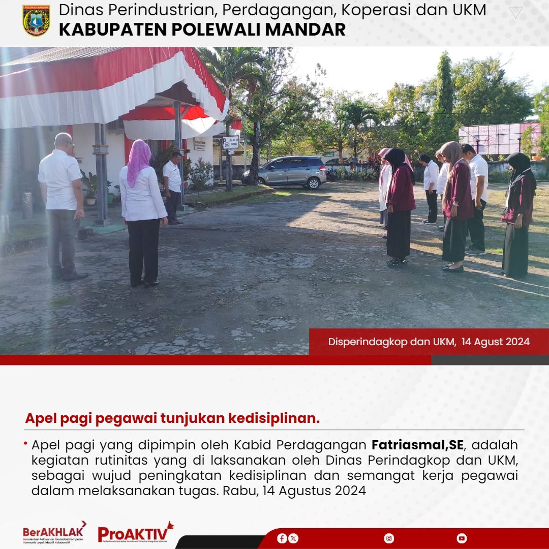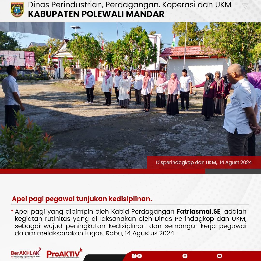Apel pagi yang dipimpin oleh Kabid Perdagangan Fatriasmal,SE, adalah kegiatan rutinitas yang di laksanakan oleh Dinas Perindagkop dan UKM, sebagai wujud peningkatan kedisiplinan dan semangat kerja pegawai dalam melaksanakan tugas. Rabu, 14 Agustus 2024