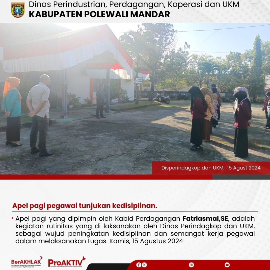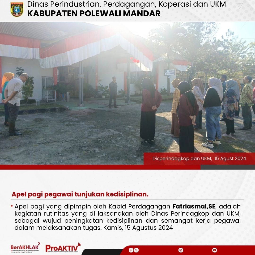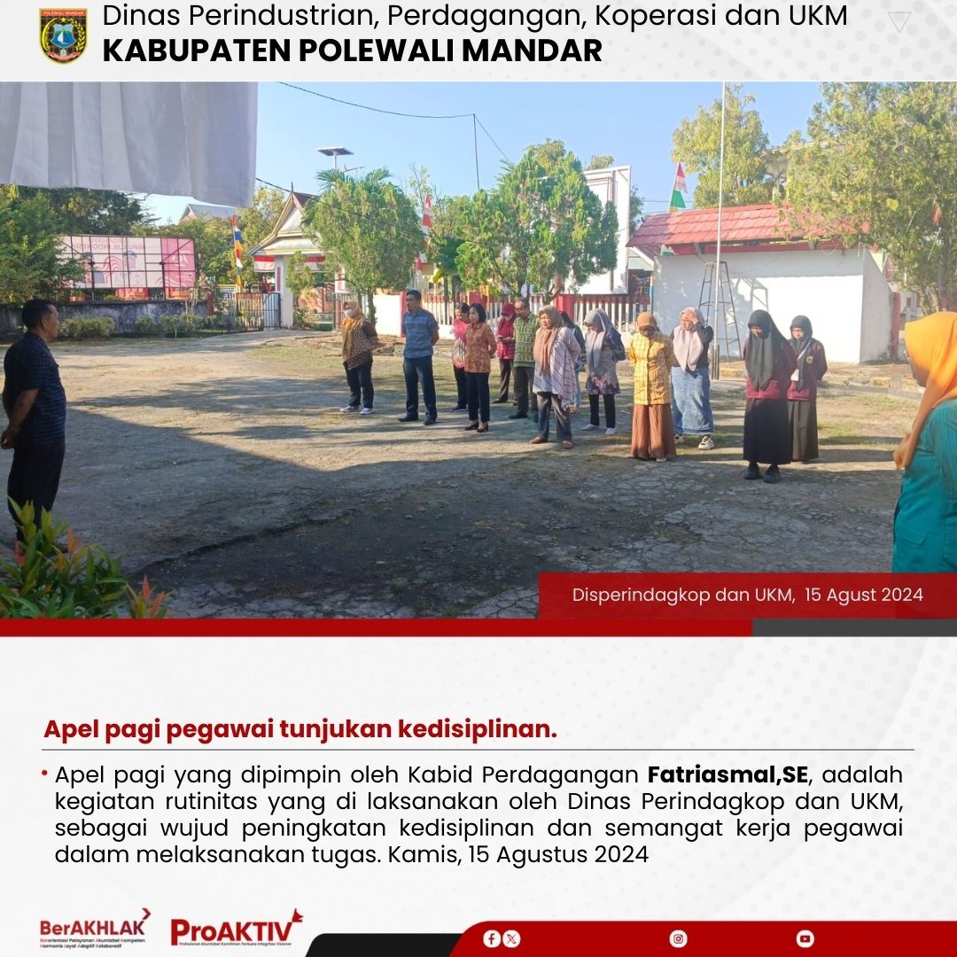 Apel pagi yang dipimpin oleh Kabid Perdagangan Fatriasmal,SE, adalah kegiatan rutinitas yang di laksanakan oleh Dinas Perindagkop dan UKM, sebagai wujud peningkatan kedisiplinan dan semangat kerja pegawai dalam melaksanakan tugas. Kamis, 15 Agustus 2024