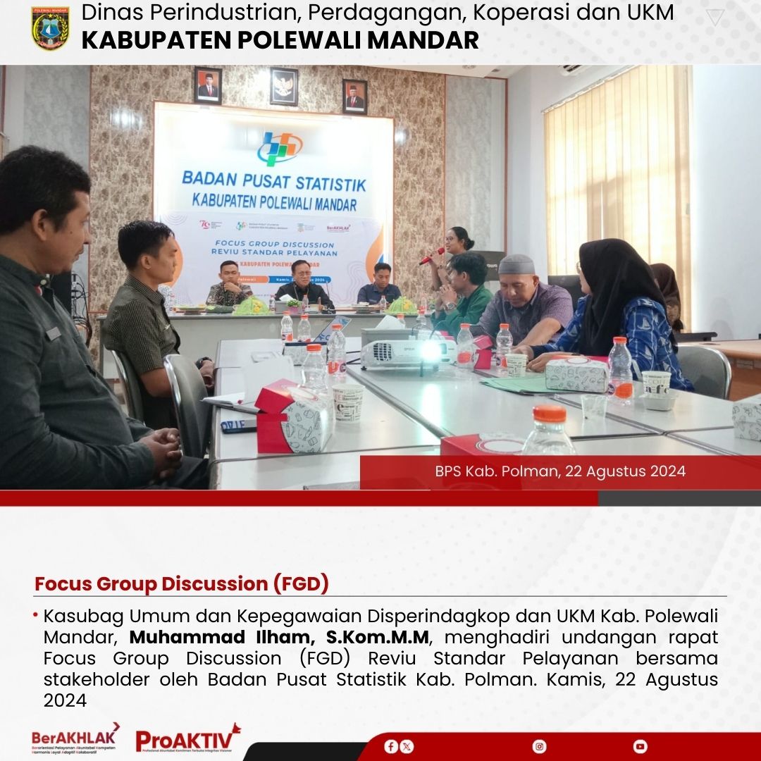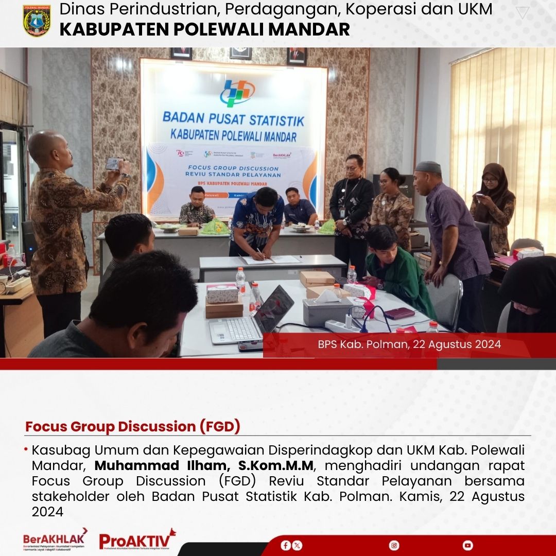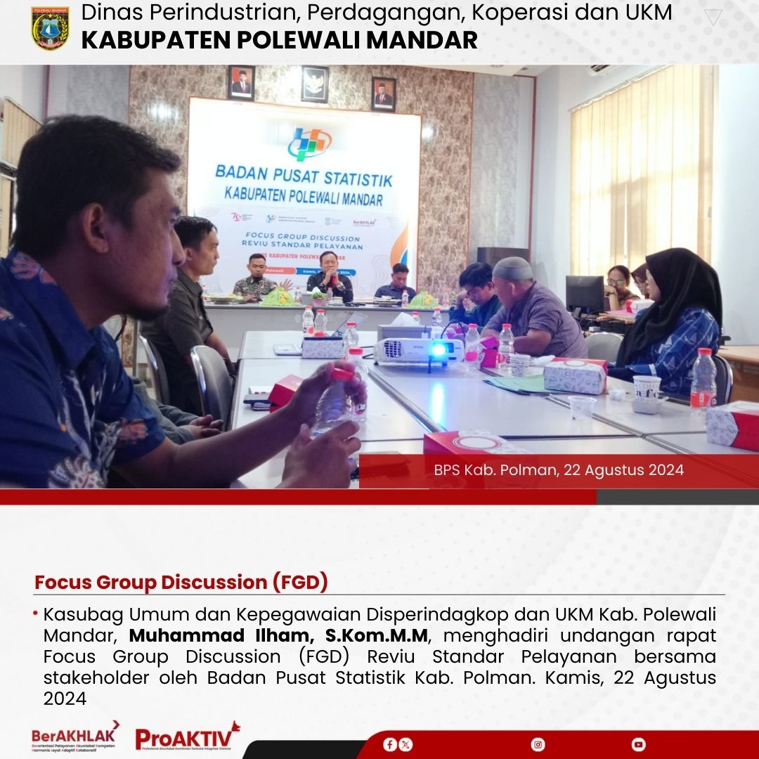 Kasubag Umum dan Kepegawaian Disperindagkop dan UKM Kab. Polewali Mandar, Muhammad Ilham, S.Kom.M.M, menghadiri undangan rapat Focus Group Discussion (FGD) Reviu Standar Pelayanan bersama stakeholder oleh Badan Pusat Statistik Kab. Polman. Kamis, 22 Agustus 2024