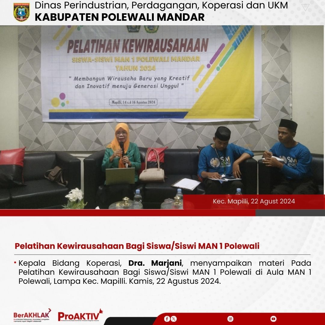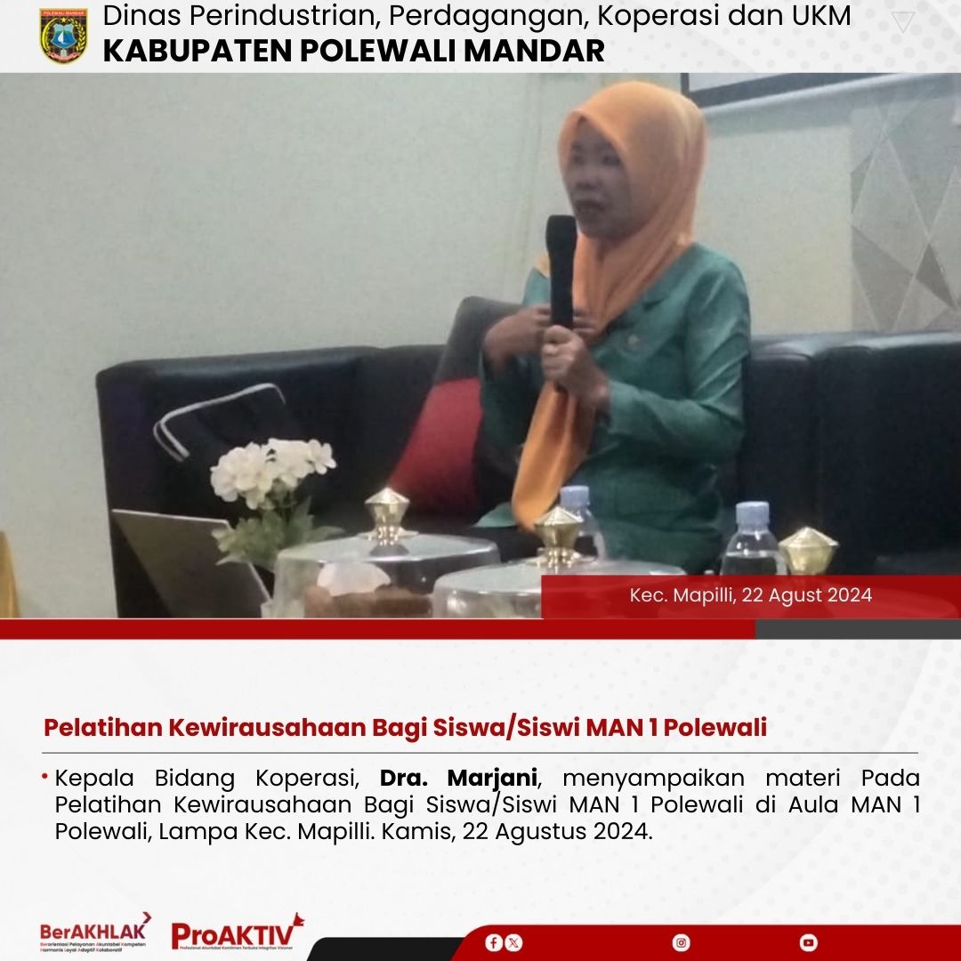 Kepala Bidang Koperasi, Dra. Marjani, menyampaikan materi Pada Pelatihan Kewirausahaan Bagi Siswa/Siswi MAN 1 Polewali di Aula MAN 1 Polewali, Lampa Kec. Mapilli. Kamis, 22 Agustus 2024.