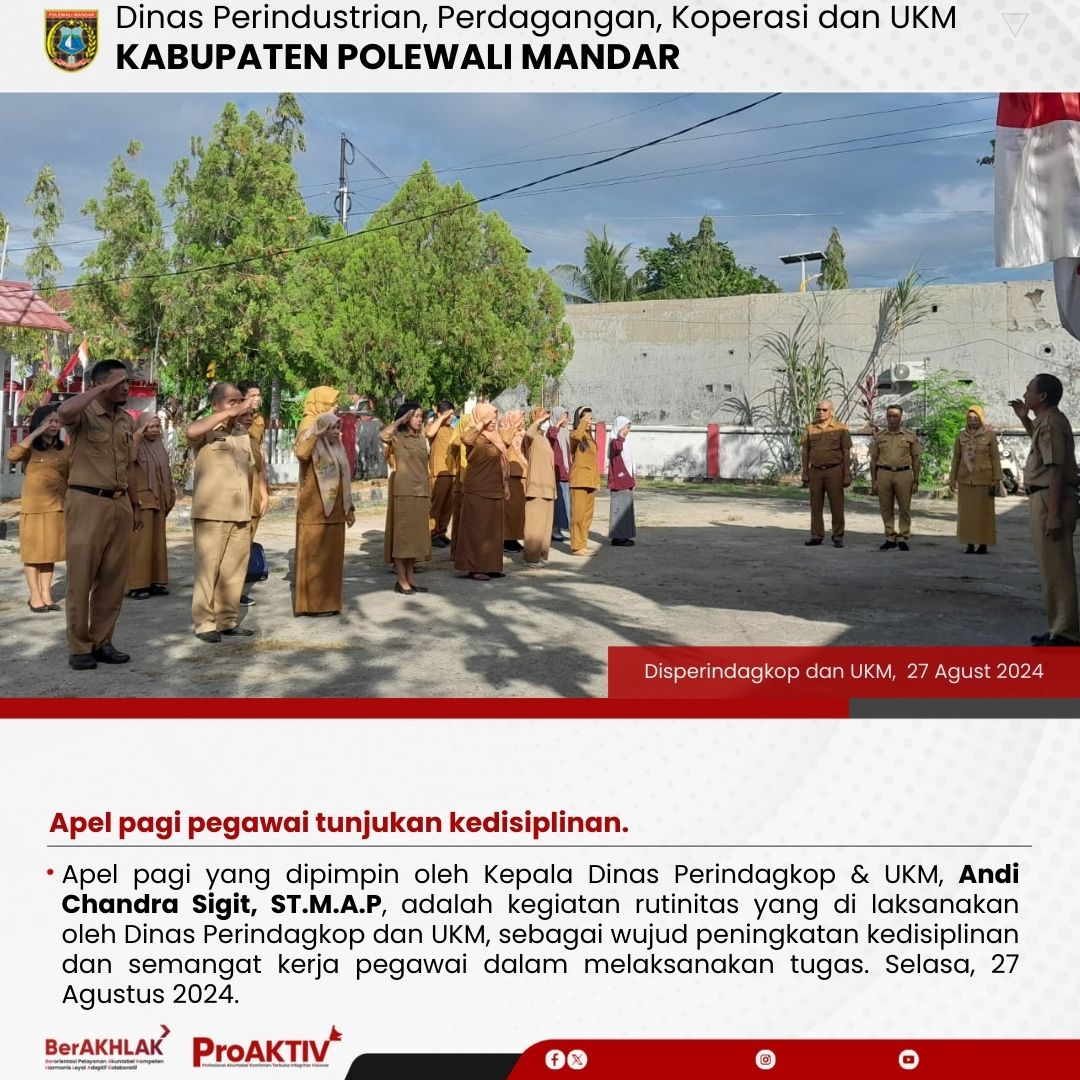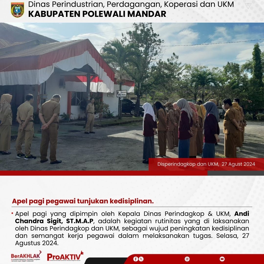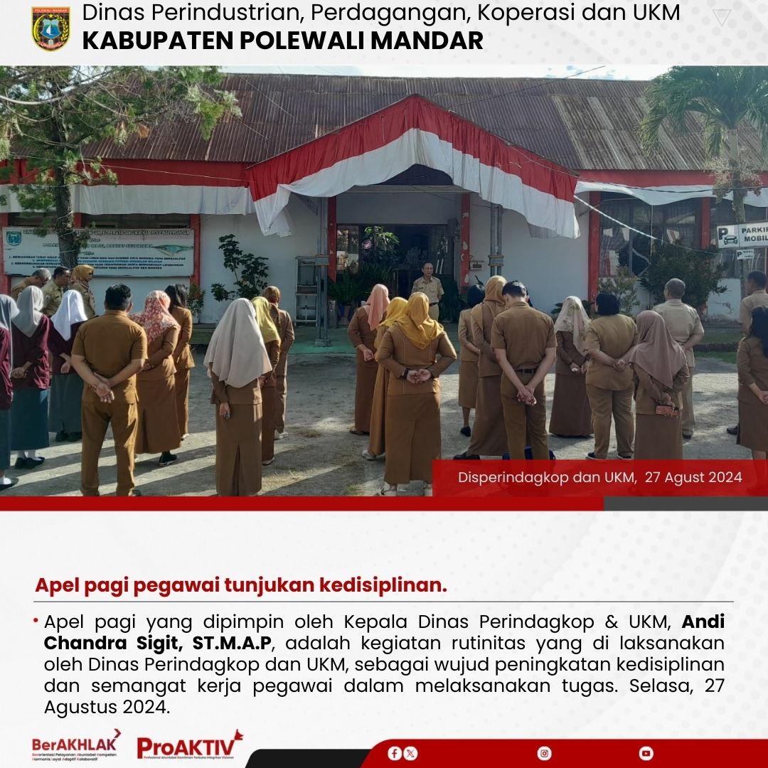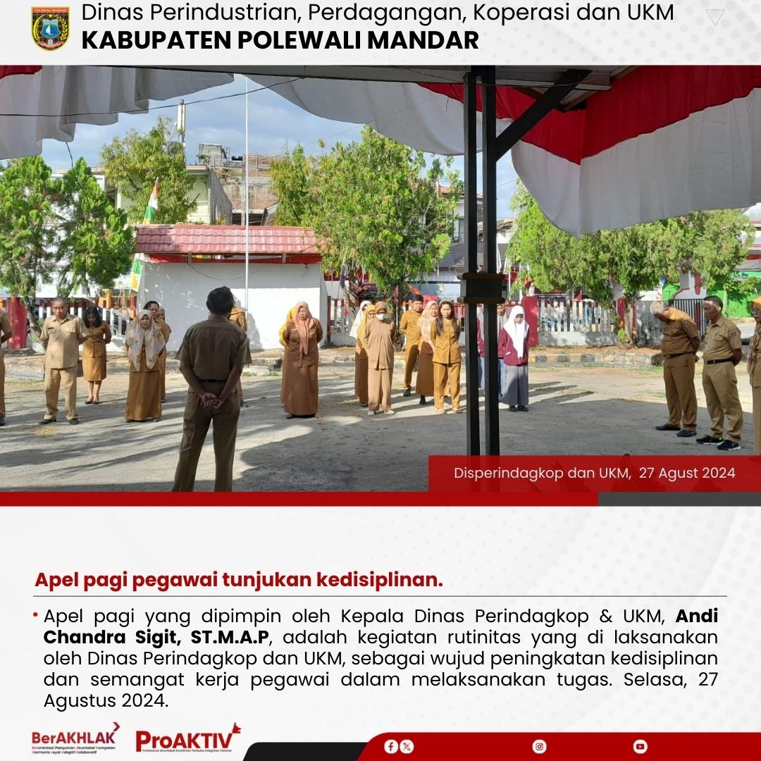 Apel pagi yang dipimpin oleh Kepala Dinas Perindagkop & UKM, Andi Chandra Sigit, ST.M.A.P, adalah kegiatan rutinitas yang di laksanakan oleh Dinas Perindagkop dan UKM, sebagai wujud peningkatan kedisiplinan dan semangat kerja pegawai dalam melaksanakan tugas. Selasa, 27 Agustus 2024.