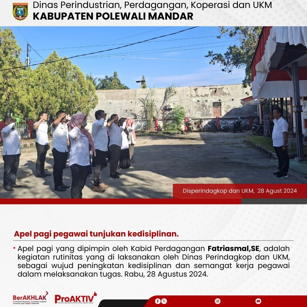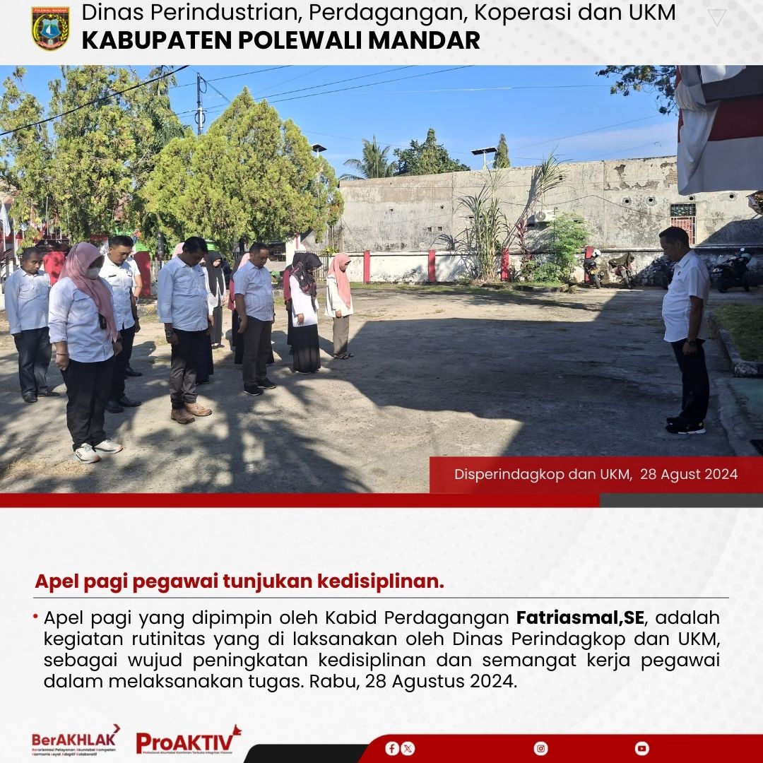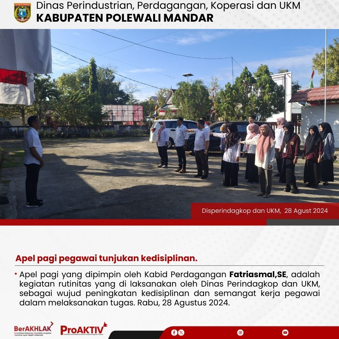 Apel pagi yang dipimpin oleh Kabid Perdagangan Fatriasmal,SE, adalah kegiatan rutinitas yang di laksanakan oleh Dinas Perindagkop dan UKM, sebagai wujud peningkatan kedisiplinan dan semangat kerja pegawai dalam melaksanakan tugas. Rabu, 28 Agustus 2024.