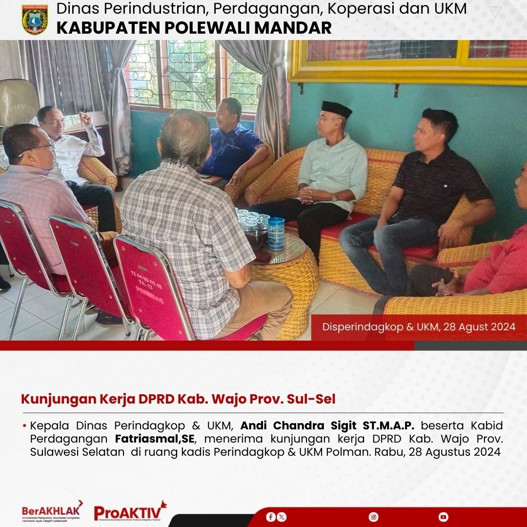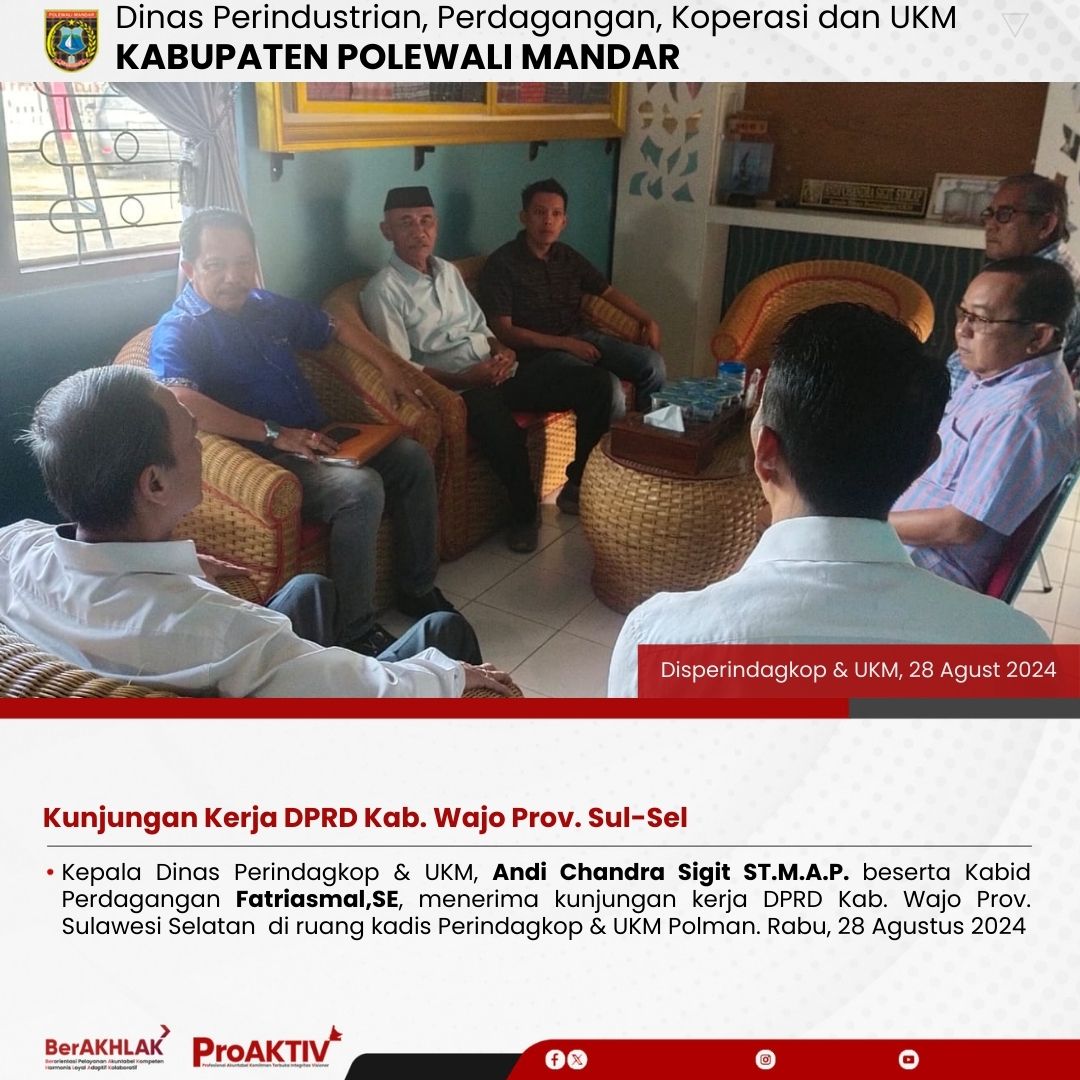 Kepala Dinas Perindagkop & UKM, Andi Chandra Sigit ST.M.A.P. beserta Kabid Perdagangan Fatriasmal,SE, menerima kunjungan kerja DPRD Kab. Wajo Prov. Sulawesi Selatan di ruang kadis Perindagkop & UKM Polman. Rabu, 28 Agustus 2024