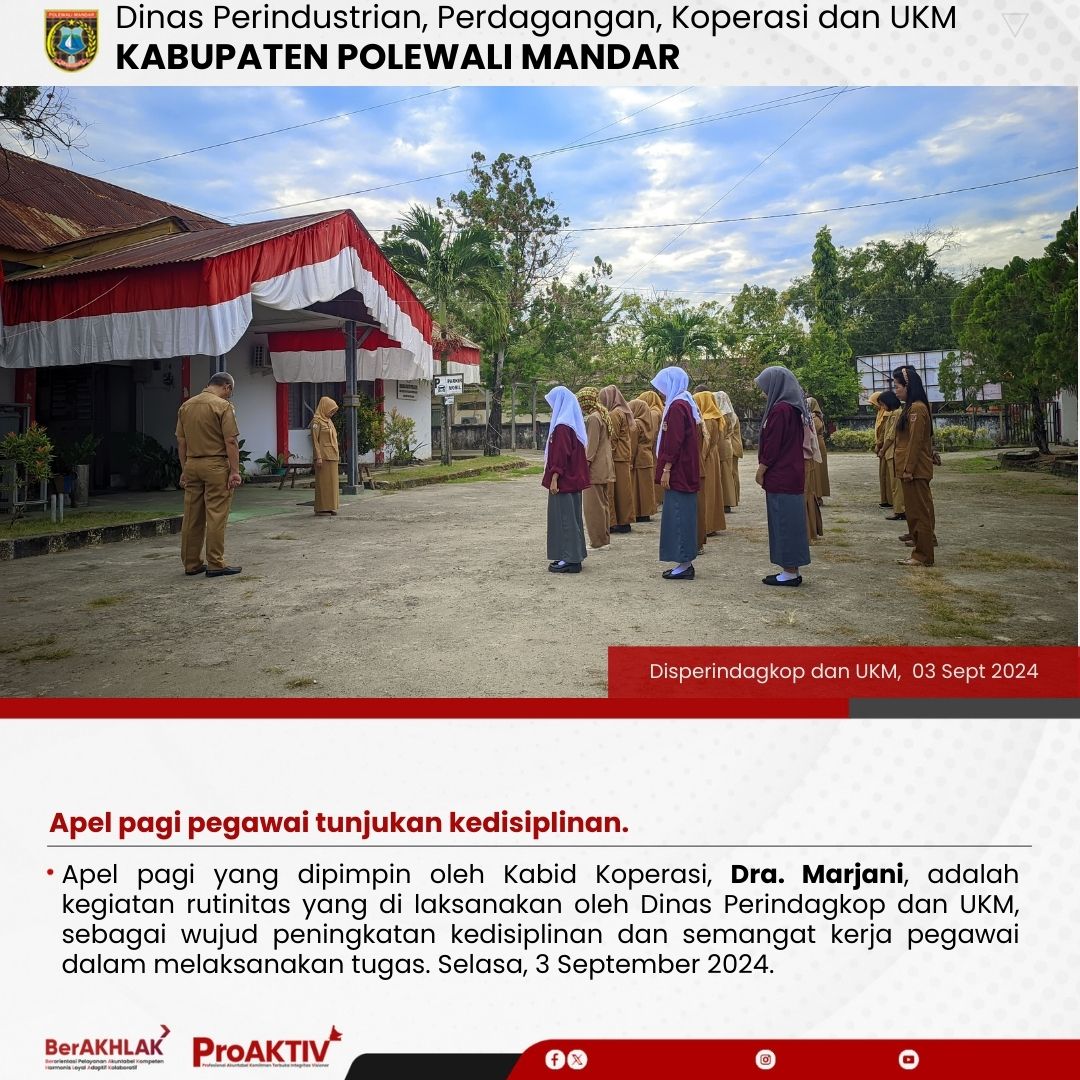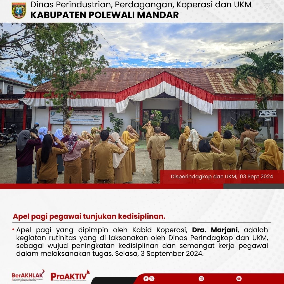 Apel pagi yang dipimpin oleh Kabid Koperasi, Dra. Marjani, adalah kegiatan rutinitas yang di laksanakan oleh Dinas Perindagkop dan UKM, sebagai wujud peningkatan kedisiplinan dan semangat kerja pegawai dalam melaksanakan tugas. Selasa, 3 September 2024.
