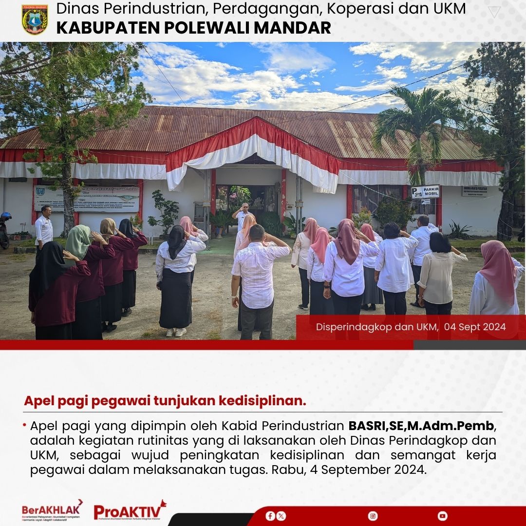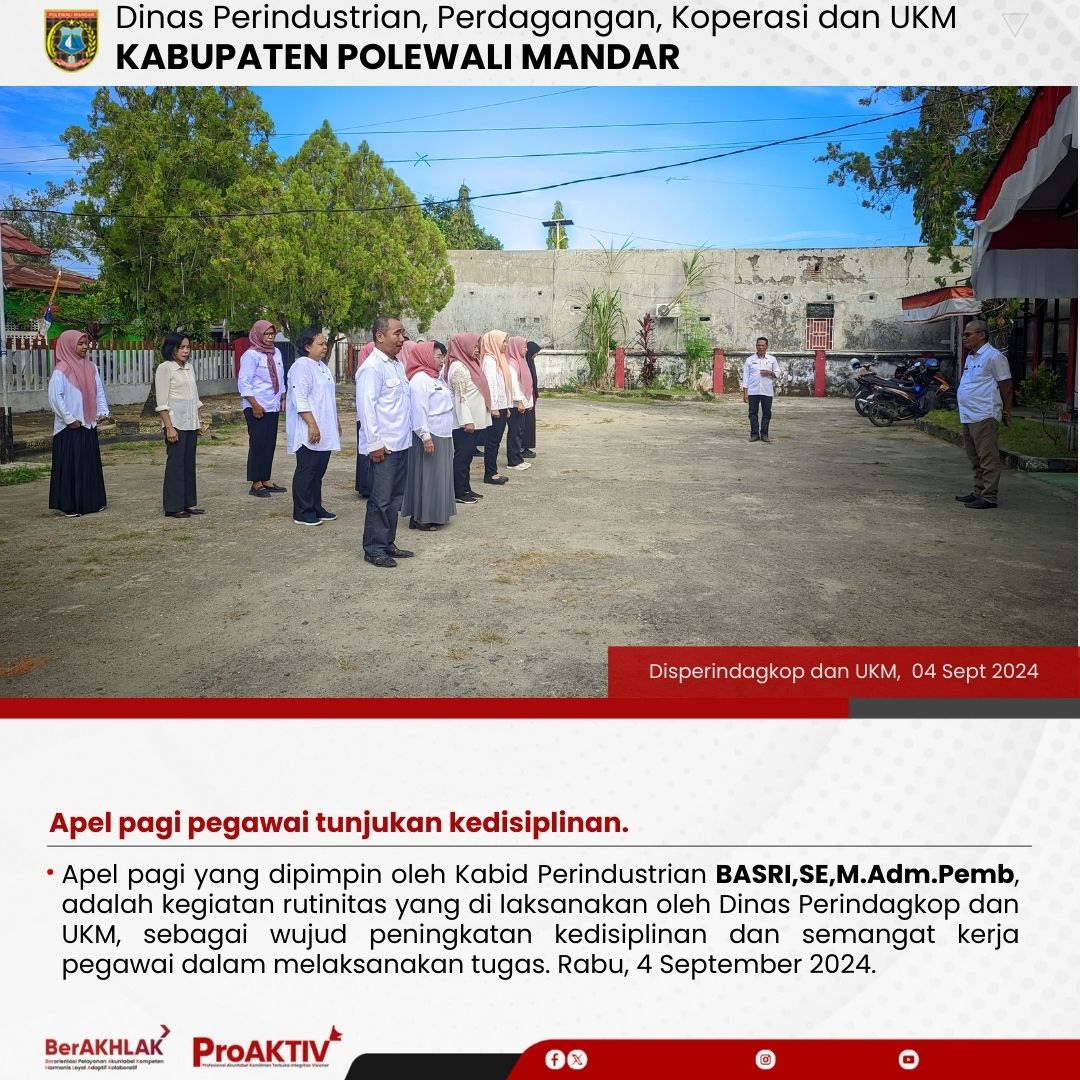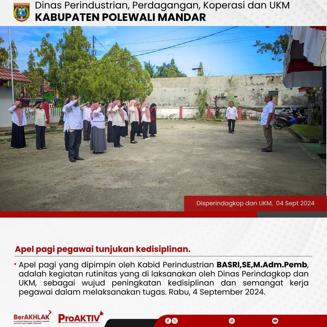 Apel pagi yang dipimpin oleh Kabid Perindustrian BASRI,SE,M.Adm.Pemb, adalah kegiatan rutinitas yang di laksanakan oleh Dinas Perindagkop dan UKM, sebagai wujud peningkatan kedisiplinan dan semangat kerja pegawai dalam melaksanakan tugas. Rabu, 4 September 2024.